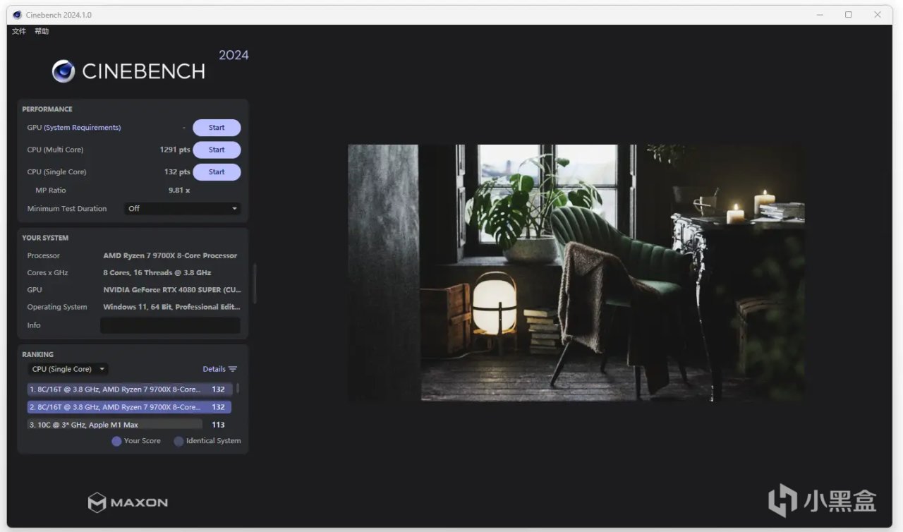 CINEBENCH 2024測試:AMD銳龍7 9700X的單核得分爲132,多核得分爲1291。