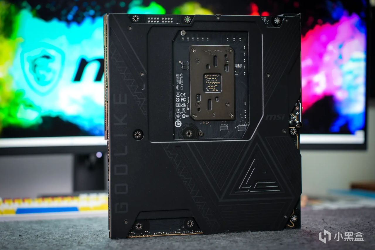 但其實主板的背面並沒有接口,而是搭載了一塊全金屬背板進行支撐。該金屬背板也是融合了MEG與超神的元素,除了能提升主板的抗拉性能,還能起到很好的散熱作用。