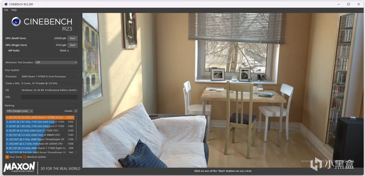 CINEBENCH R23測試:AMD銳龍7 9700X的單核得分爲2153,多核得分爲22920。