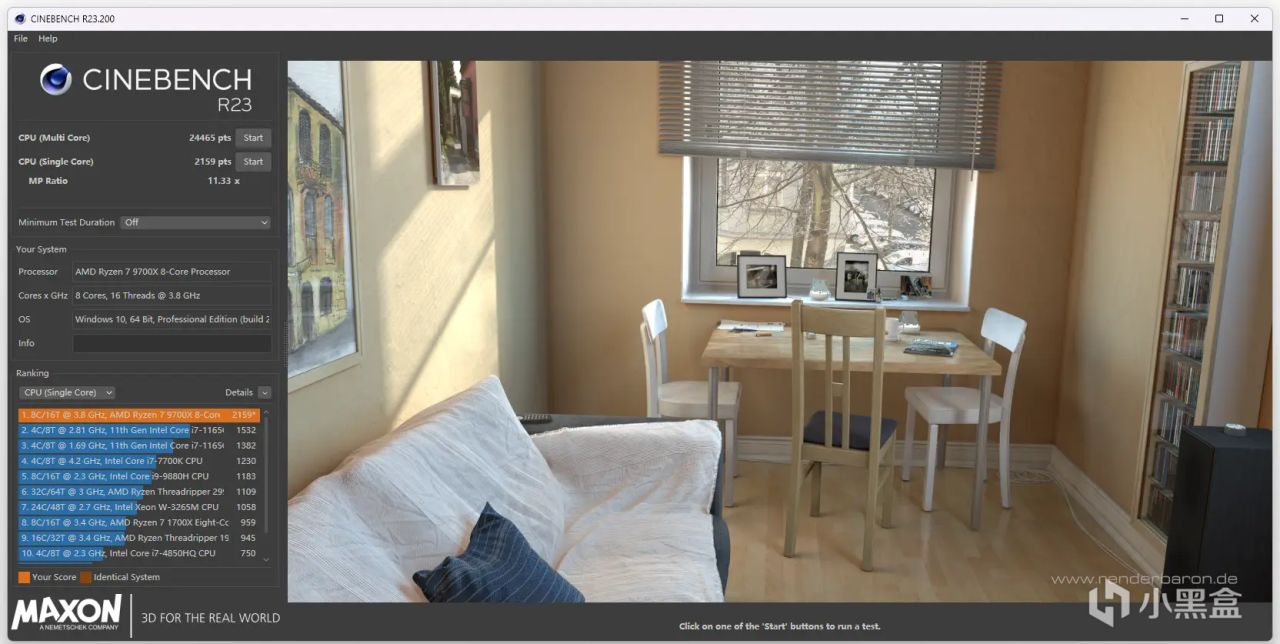 CINEBENCH R23測試:AMD銳龍7 9700X的單核得分爲2159,多核得分爲24465。