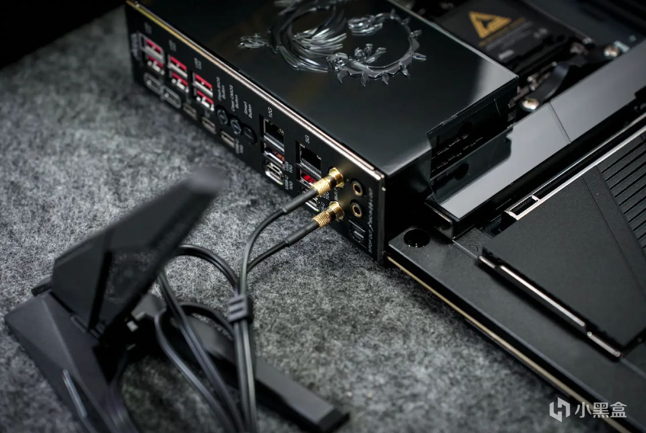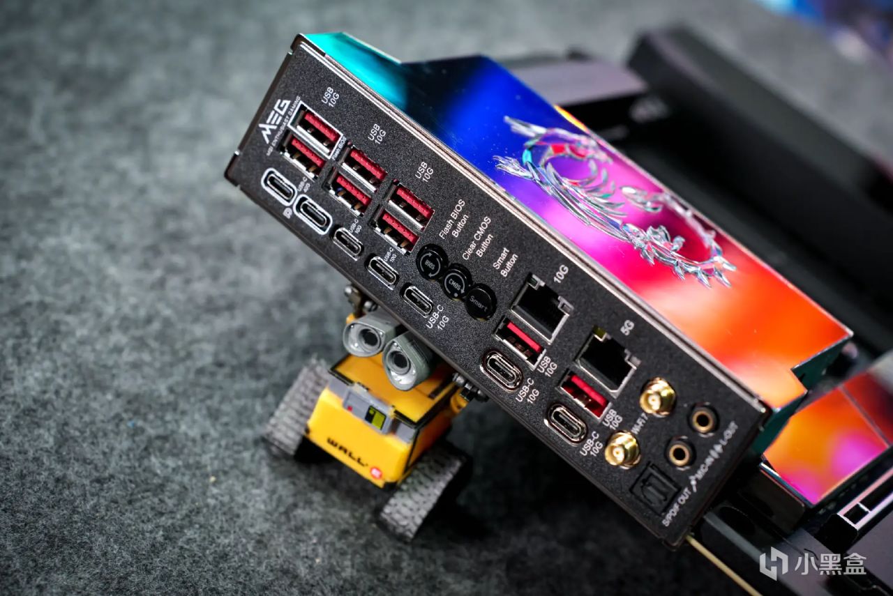 在一體化I/O面板方面上,微星MEG X870E GODLIKE超神主板也是火力全開,拓展性能也絕對是目前行業的標杆。比如USB-A接口一共配備了8個,還都是10Gbps帶寬;Type-C接口也是有5個,也是10Gbps帶寬;同時還有2個全功能的USB 4.0接口(帶DP視頻輸出),帶寬爲40Gbps。網絡方面,該主板搭載了2個RJ45有線網口,帶寬分別是10Gbps和5Gbps,無線網絡則是支持WiFi 7,並且天線接口也是快拆設計,安裝拆卸更輕鬆。