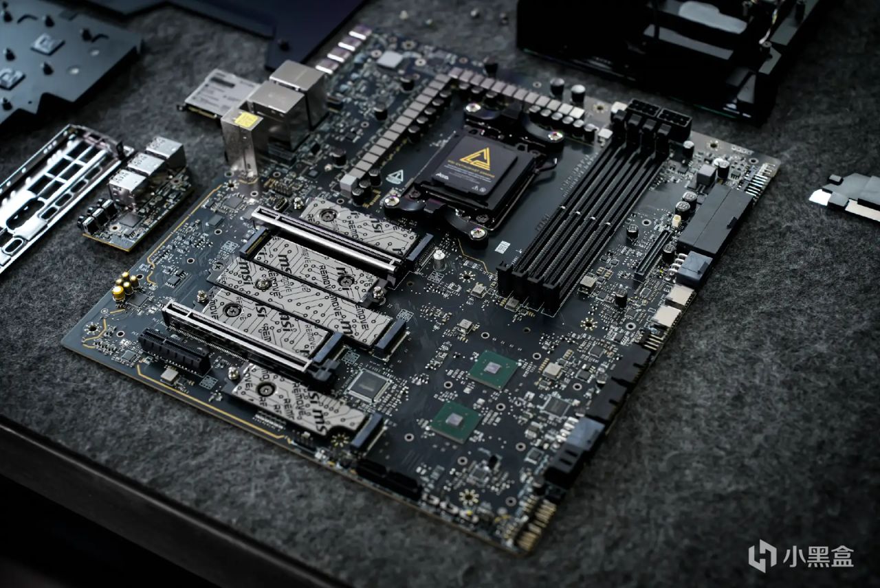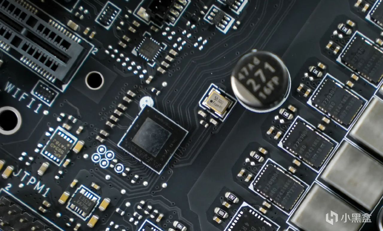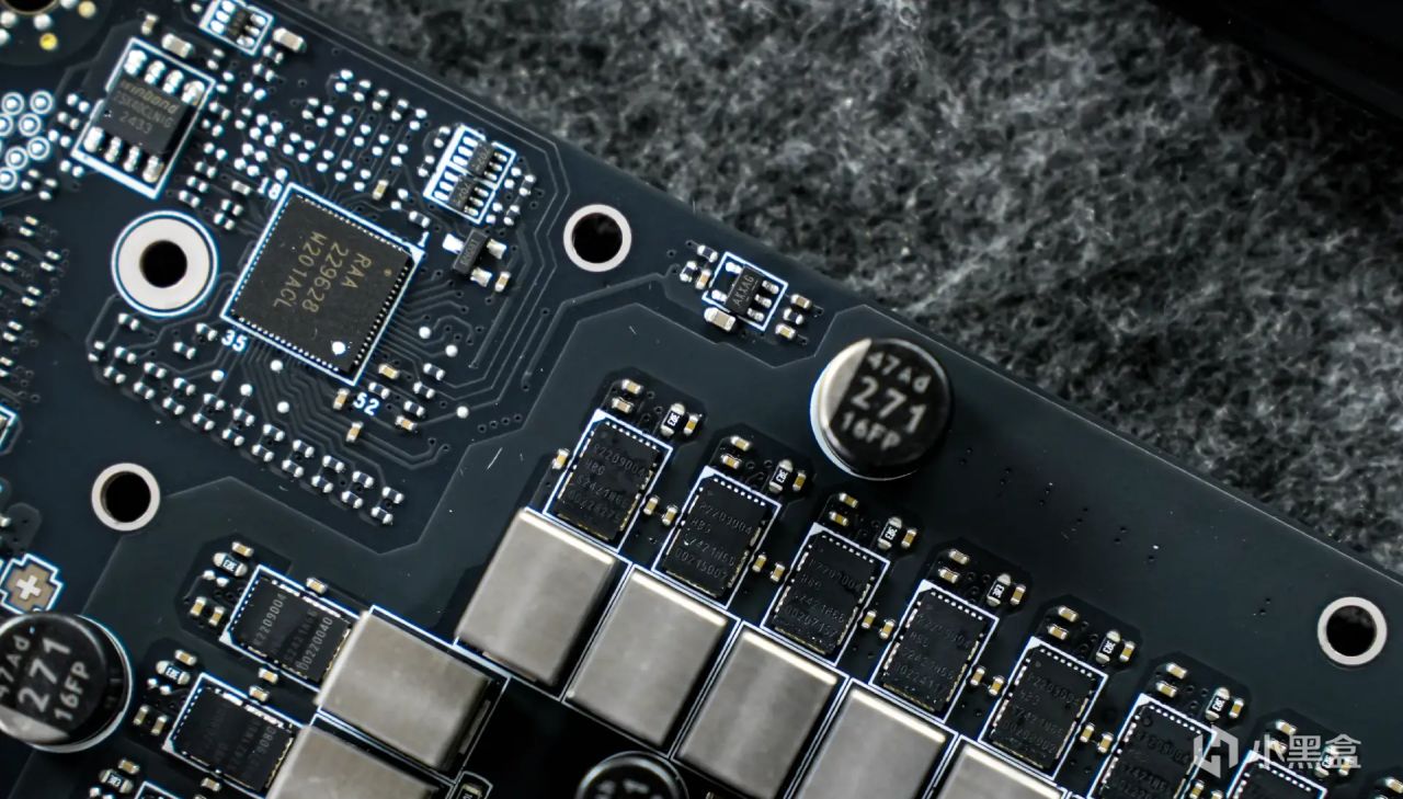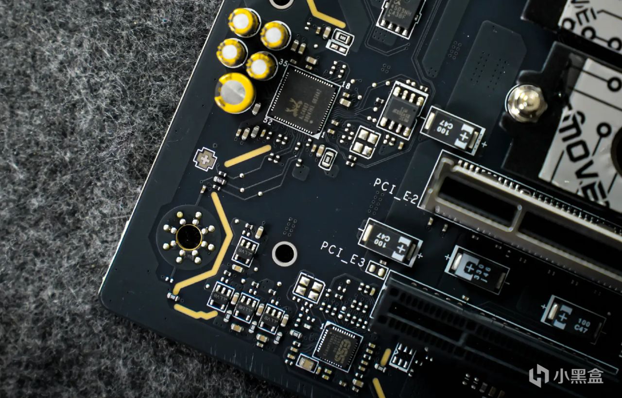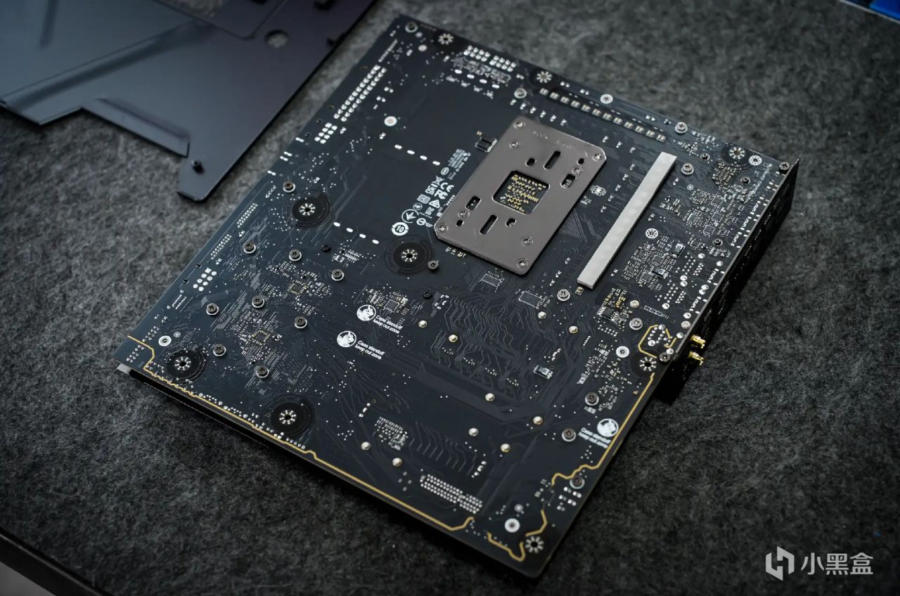 拆解到背板後,可以看到CPU供電單元的MLCC電容也使用了導熱硅膠墊。並且在主板在PCB用料方面也是非常大氣,爲10層PCB+2盎司銅服務器級設計,確保卓越的電氣性能,也爲極限超頻打下堅實的基礎。