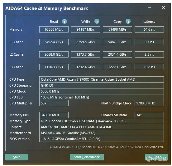讀取速度爲63858MB/s,寫入速度爲91187MB/s,複製速度爲61498MB/s,延遲爲64.6ns。