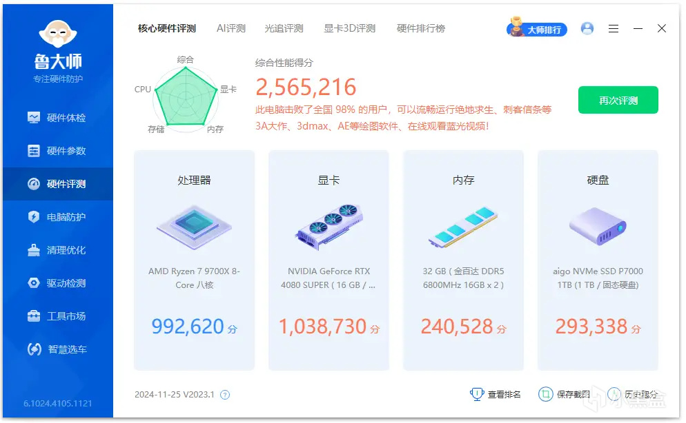 因爲目前AMD最新的銳龍7 9800X3D很難搶到,所以這次評測我還是用的AMD銳龍7 9700X處理器。