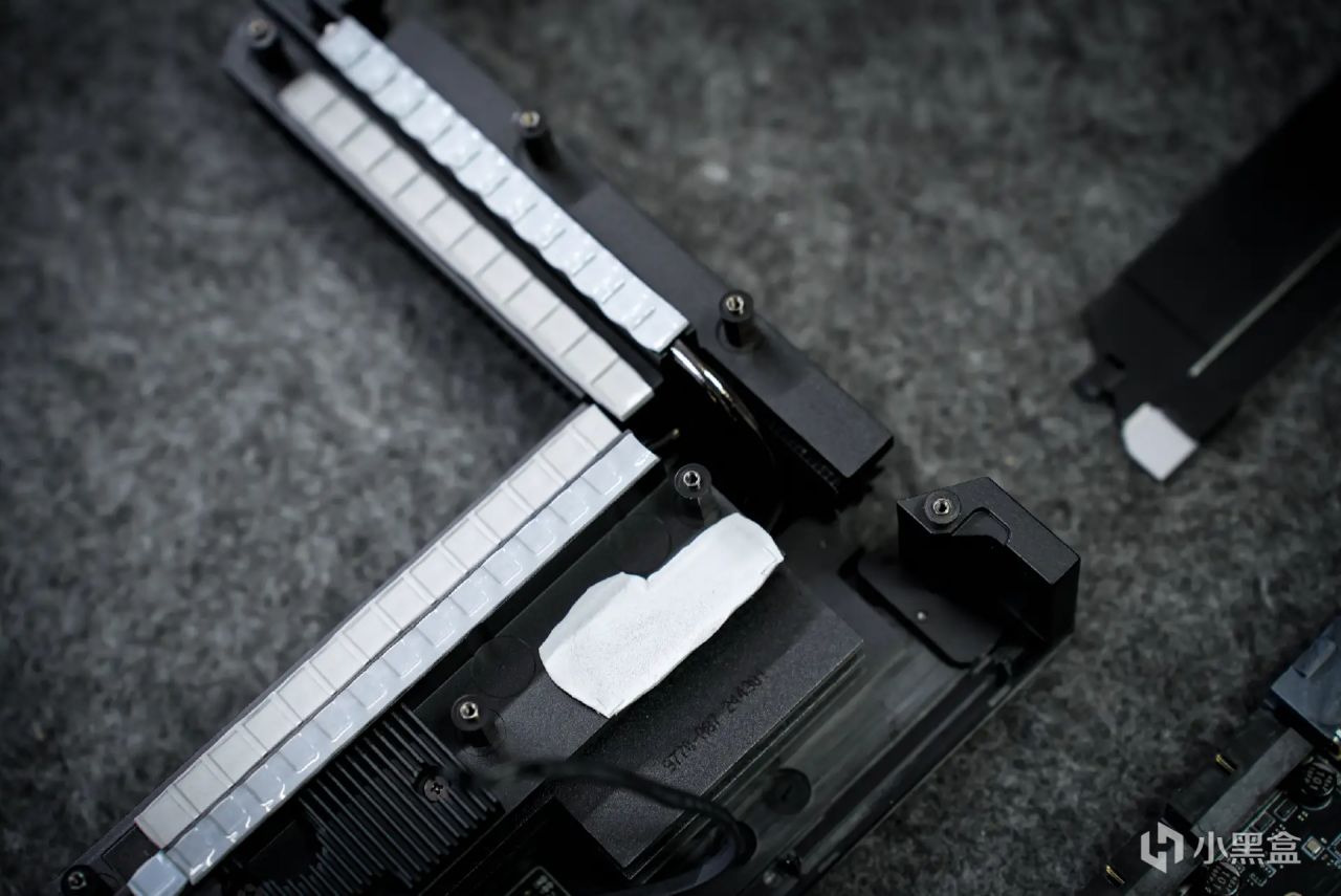 首先是碩大的VRM散熱模組,可以看到內部有交叉設計的熱管以及導熱係數高達9.0W/mk的導熱硅膠墊。