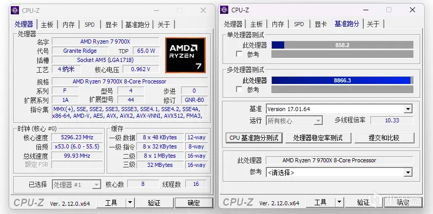CPU-Z測試:AMD銳龍7 9700X的單核得分爲858.2,多核性能爲8866.3。