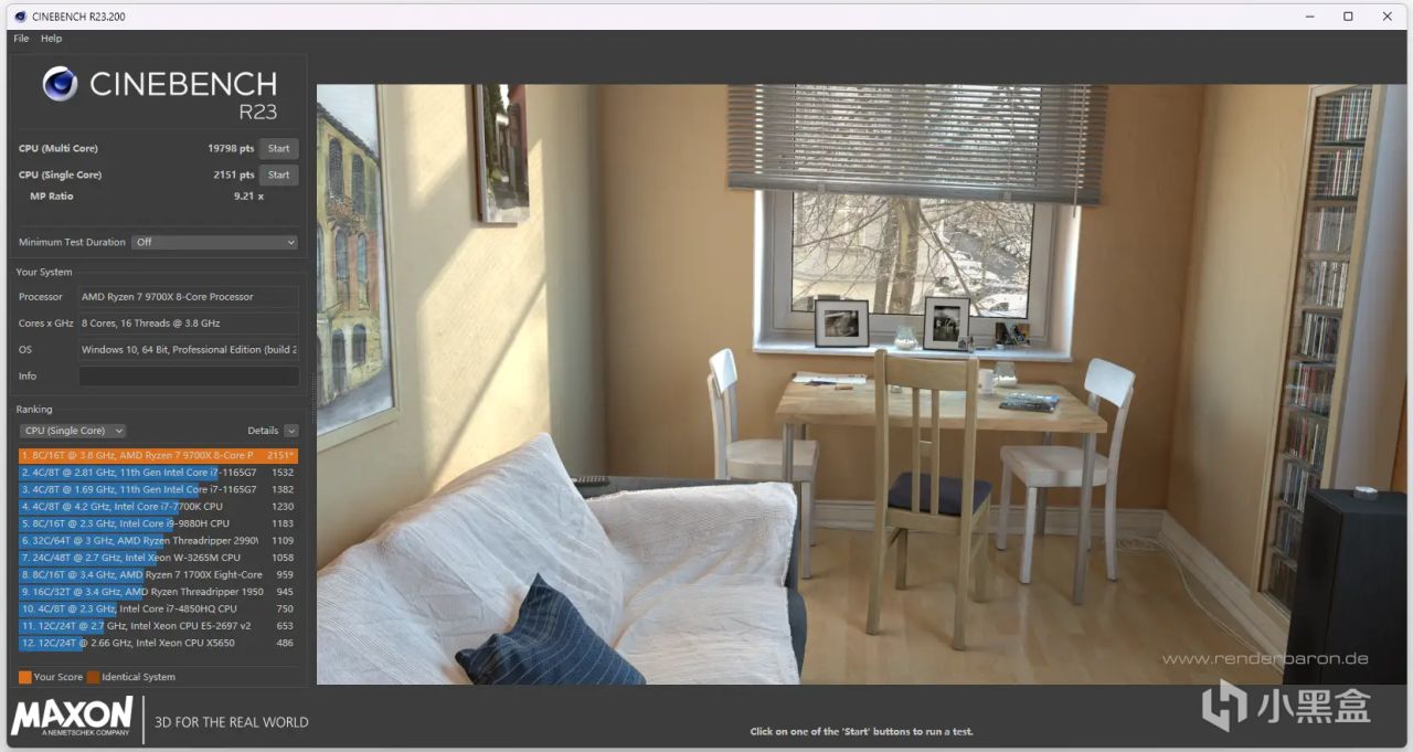 CINEBENCH R23測試:AMD銳龍7 9700X的單核得分爲2151,多核得分爲19798。