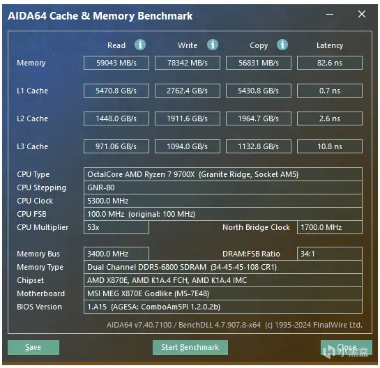 讀取速度爲59043MB/s,寫入速度爲78342MB/s,複製速度爲56831MB/s,延遲爲82.6ns。