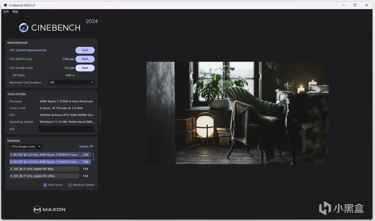 CINEBENCH 2024測試:AMD銳龍7 9700X的單核得分爲132,多核得分爲1166。