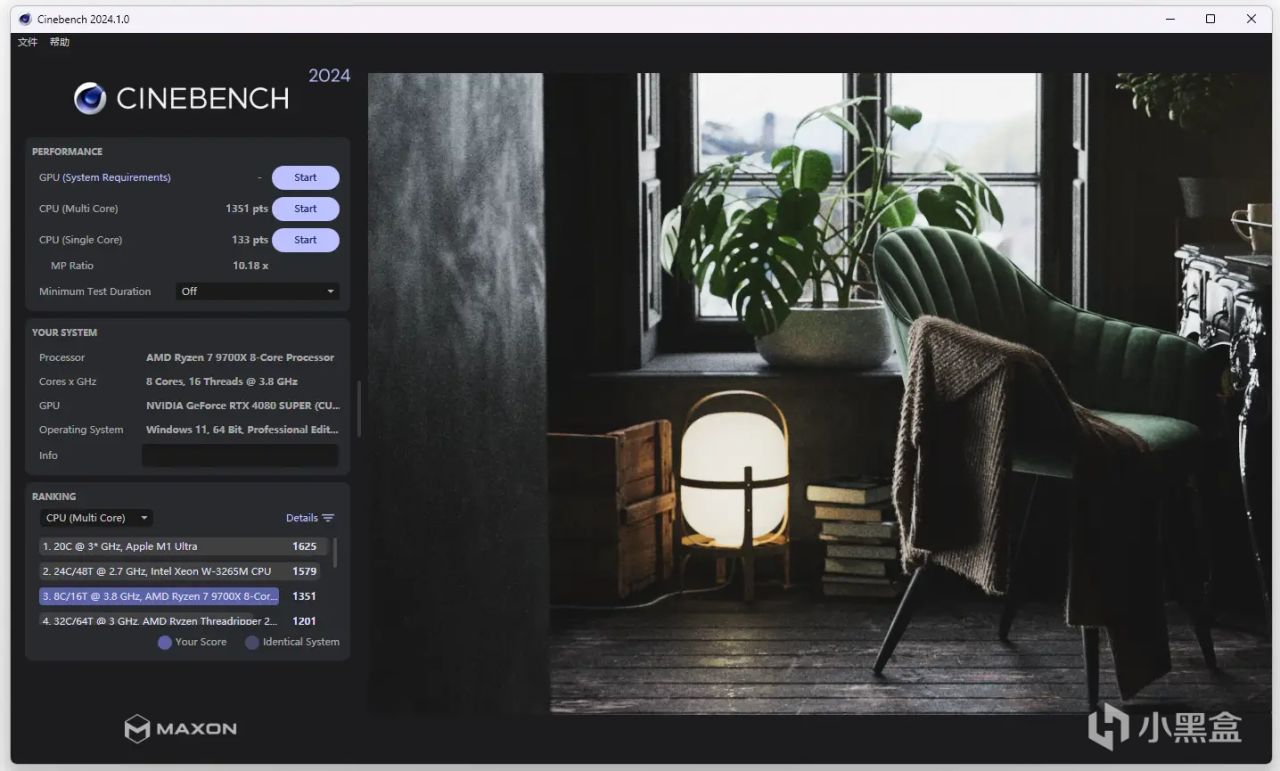 CINEBENCH 2024測試:AMD銳龍7 9700X的單核得分爲133,多核得分爲1351。