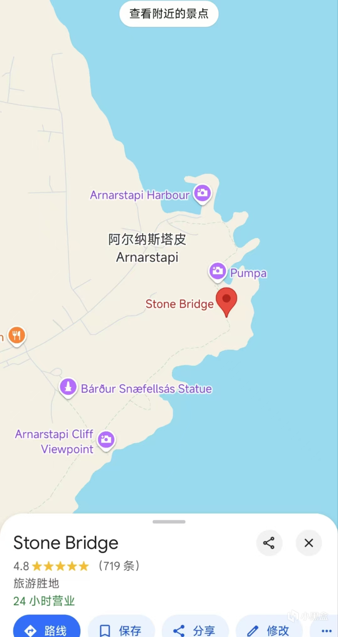 此時行程已經從冰島東北部來到了西北部,石橋位於斯奈山半島的阿爾納斯塔皮,和遊戲內港口節點城旁的一處石拱門較相似。