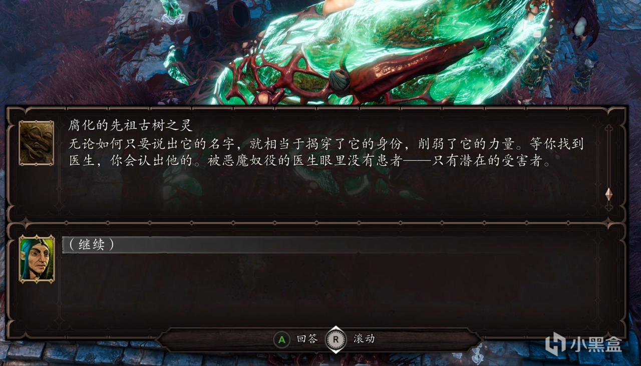 與其交流得知,他們正在折磨古樹迫使它說出惡魔的名字,一旦知道了惡魔的名字就能徹底地束縛惡魔!但是束縛惡魔後目的爲何,尚不得知。隨後黑環即刻施法開始對古樹施壓,然而知道古樹真相的我們,絕不允許黑環這般胡來