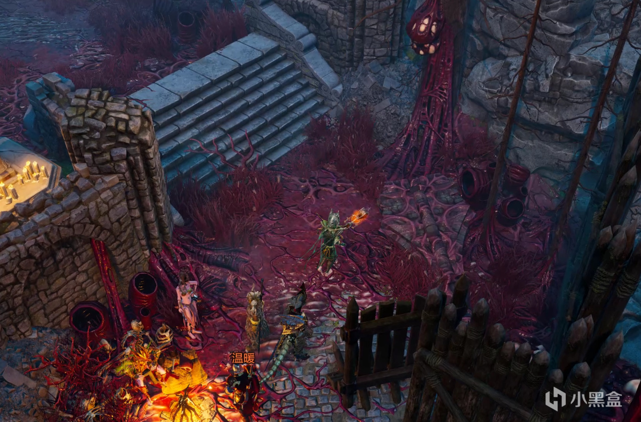 越過斷橋,一股腐爛的血腥味兒鑽進鼻腔,這座島無論是跟哪裏相比,都足以稱得上人間煉獄。四人做好心理準備,推開了面前的木柵門。 剛一開門,恐怖的景象映入眼簾,紅色的植被、遍地的膿瘡、被詛咒的地面。一個人守在門口前用虛弱的聲音像我們搭訕,無論我們怎麼回應他,他都不予理睬,只是不停重複:向西走,去找我的主人