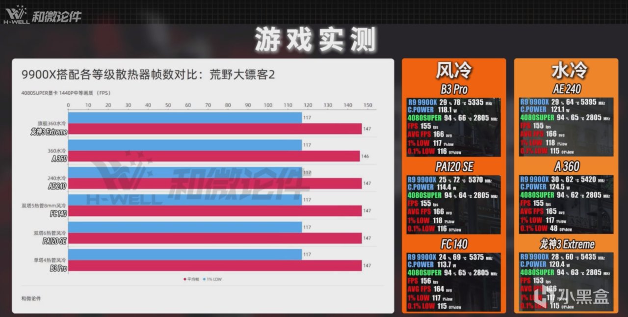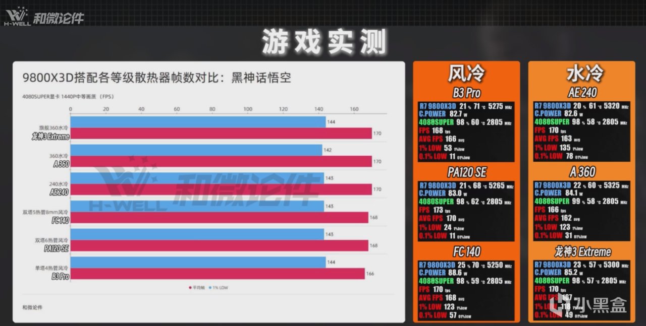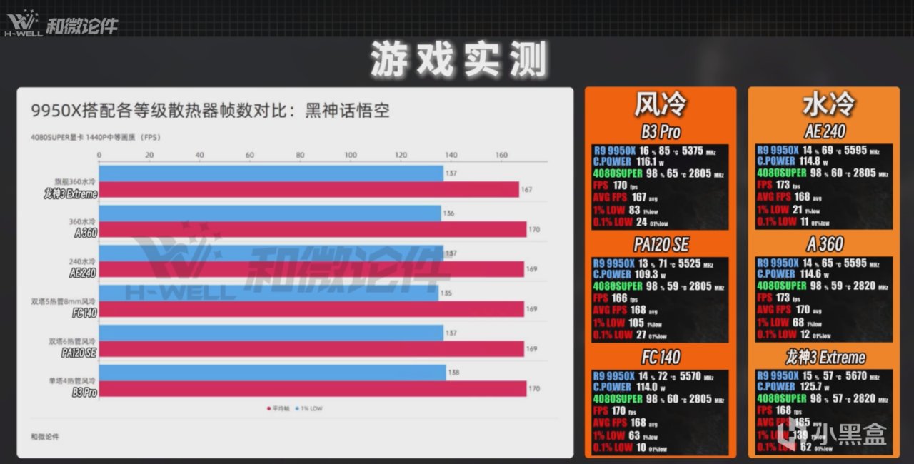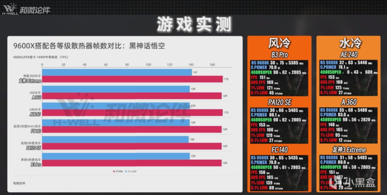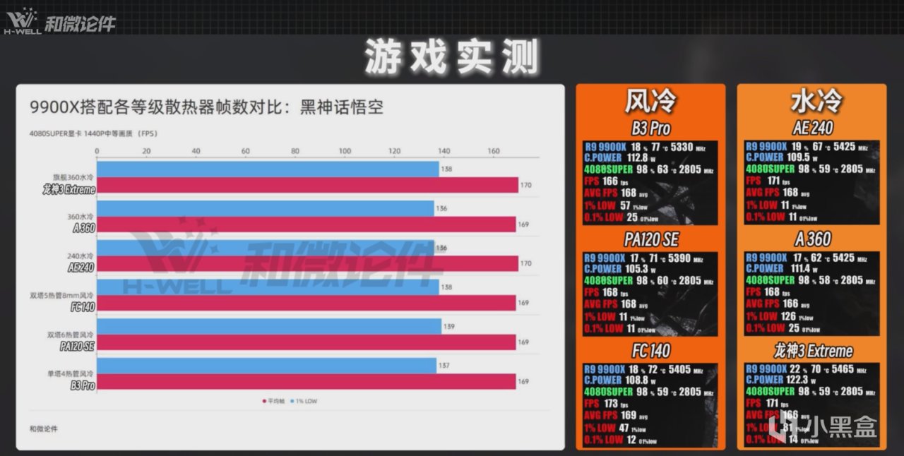 黑神話悟空,顯卡表示壓力很大,大家的幀數都在170左右,只有單塔風冷稍有掉隊,爲166幀,LOW幀大家也非常穩定,都有144幀左右的完美高刷表現。