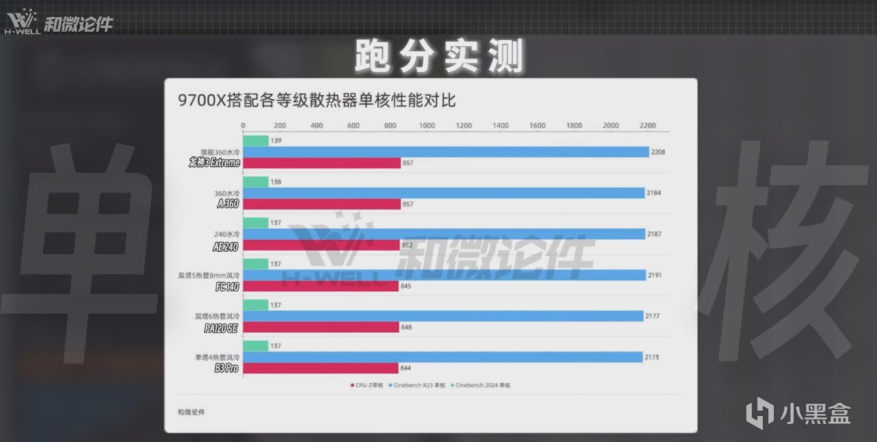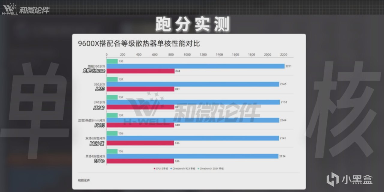 頻率跟跑分息息相關,單核性能這邊,得益於稍高的頻率,搭配旗艦360水冷的9600X平均領先單塔4熱管的B3 Pro 1.8%左右。