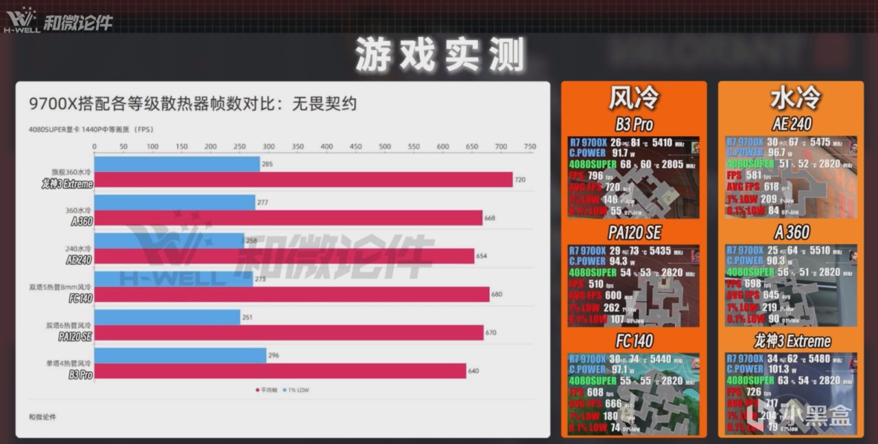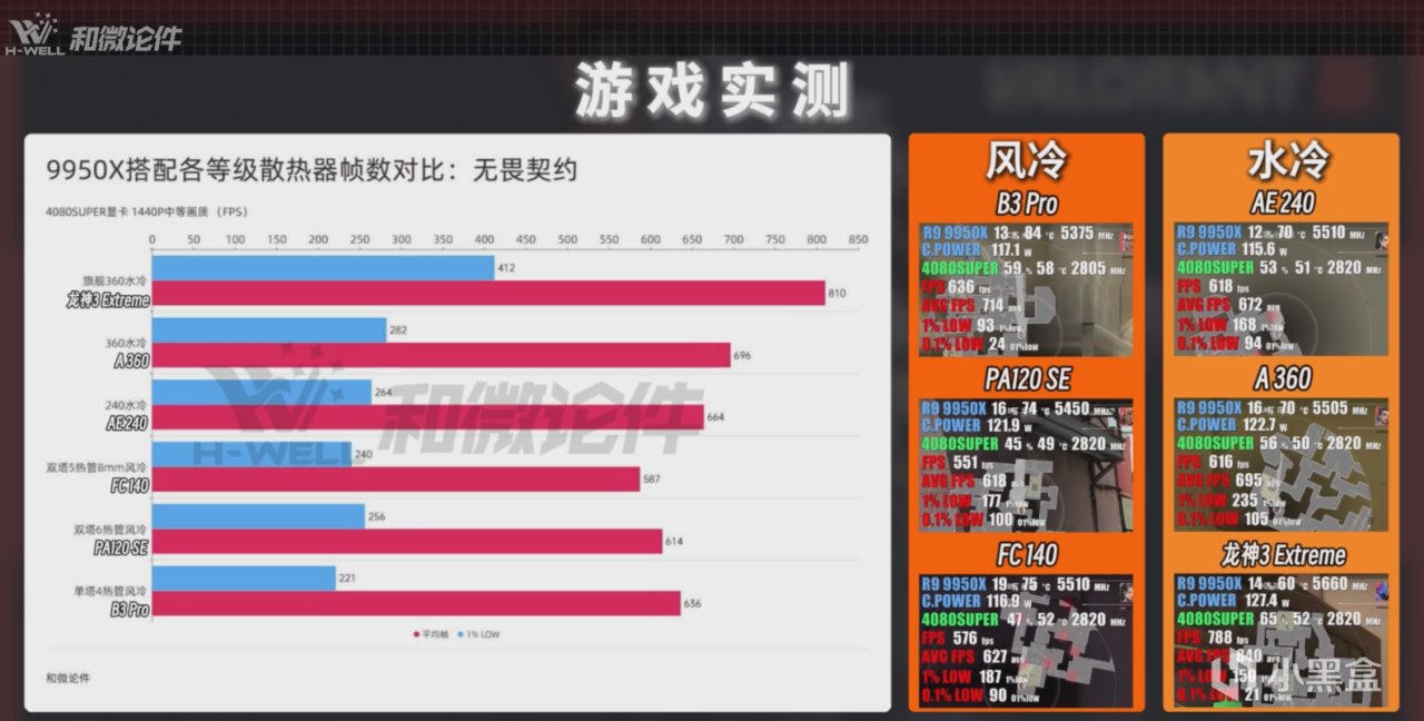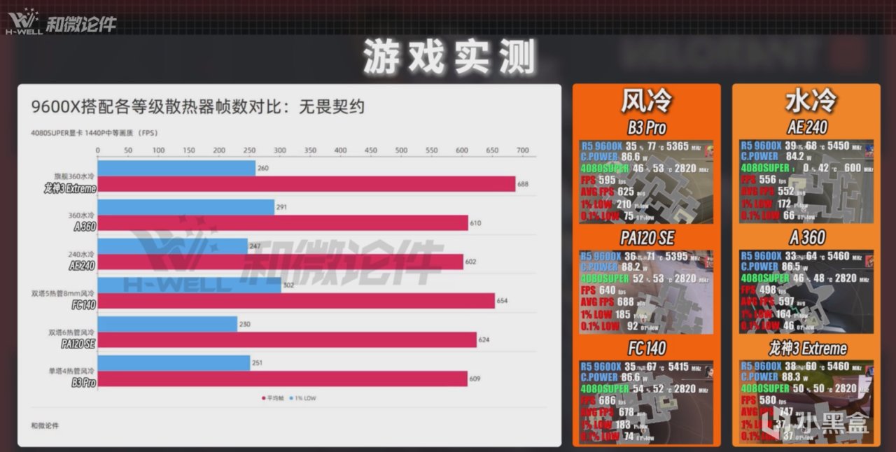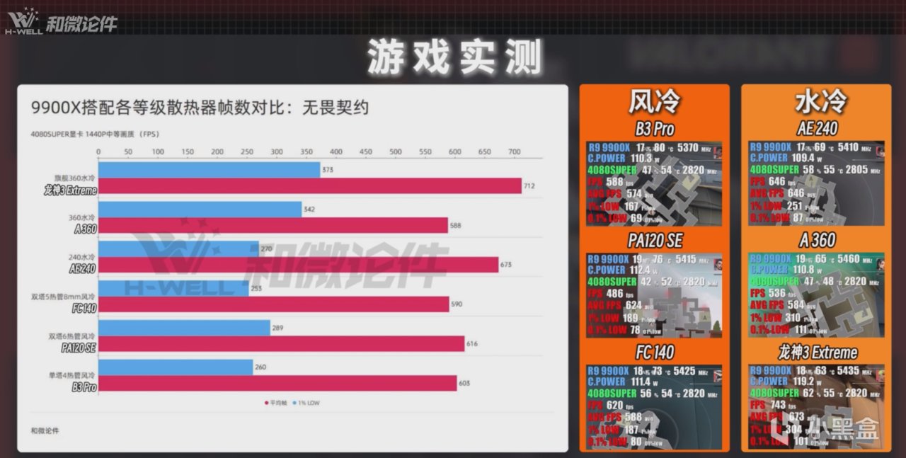 雙塔風冷要弱2%,旗艦風冷弱1.5%,240水和360水都能將總體幀數差距拉近到1%以內。我的建議是,純玩遊戲,可以上到240水冷,不能接受水冷的話,建議雙塔風冷,風冷之王確實更好,但也只比雙塔風冷強0.5%,對於9600X過於奢侈了。