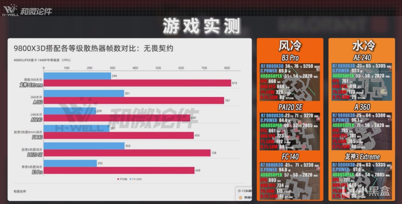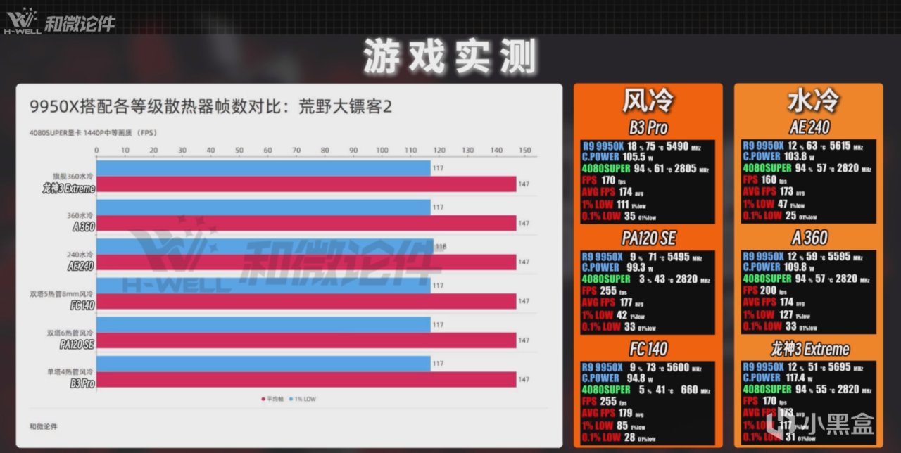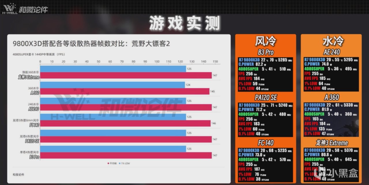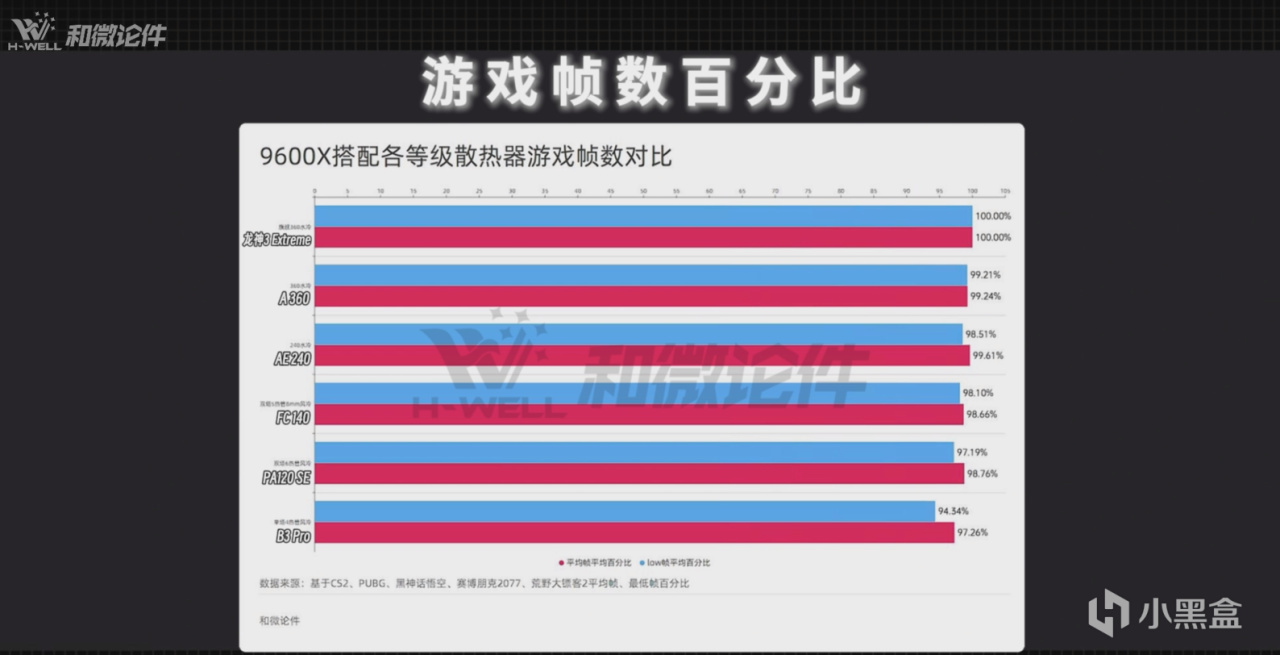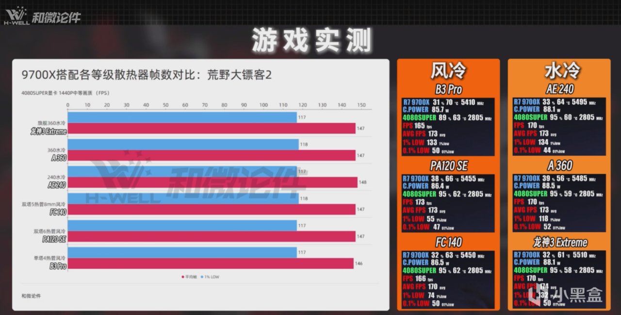 雙塔風冷要弱2%,旗艦風冷弱1.5%,240水和360水都能將總體幀數差距拉近到1%以內。我的建議是,純玩遊戲,可以上到240水冷,不能接受水冷的話,建議雙塔風冷,風冷之王確實更好,但也只比雙塔風冷強0.5%,對於9600X過於奢侈了。