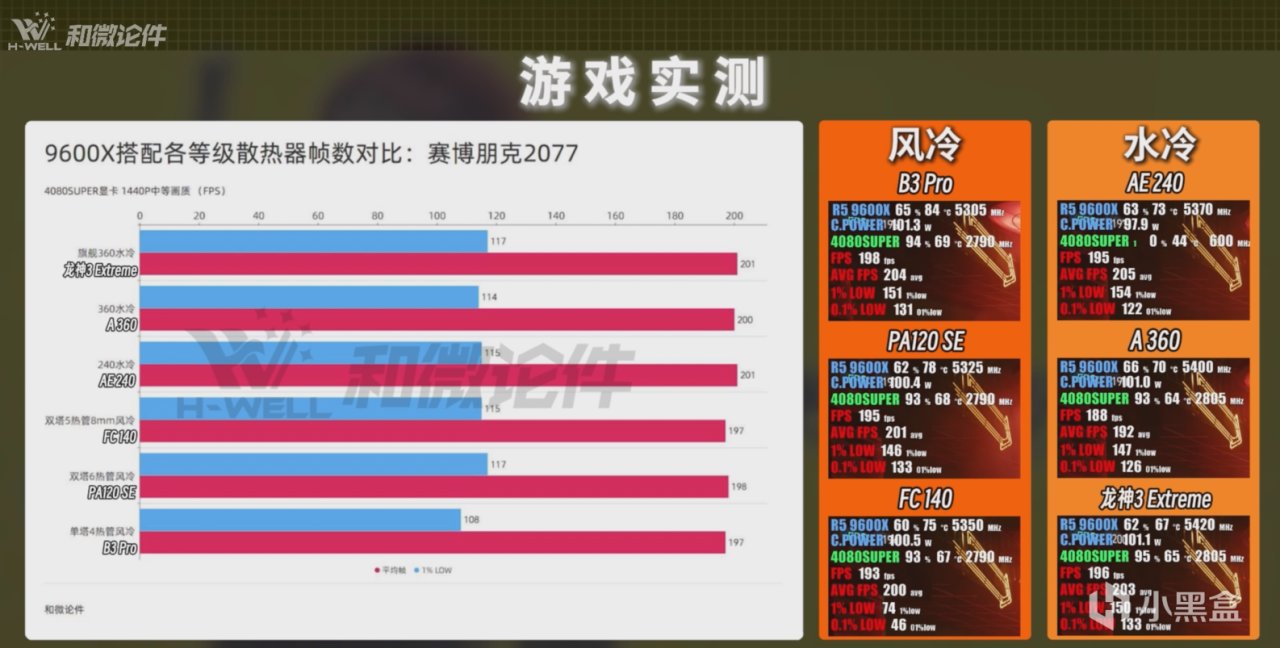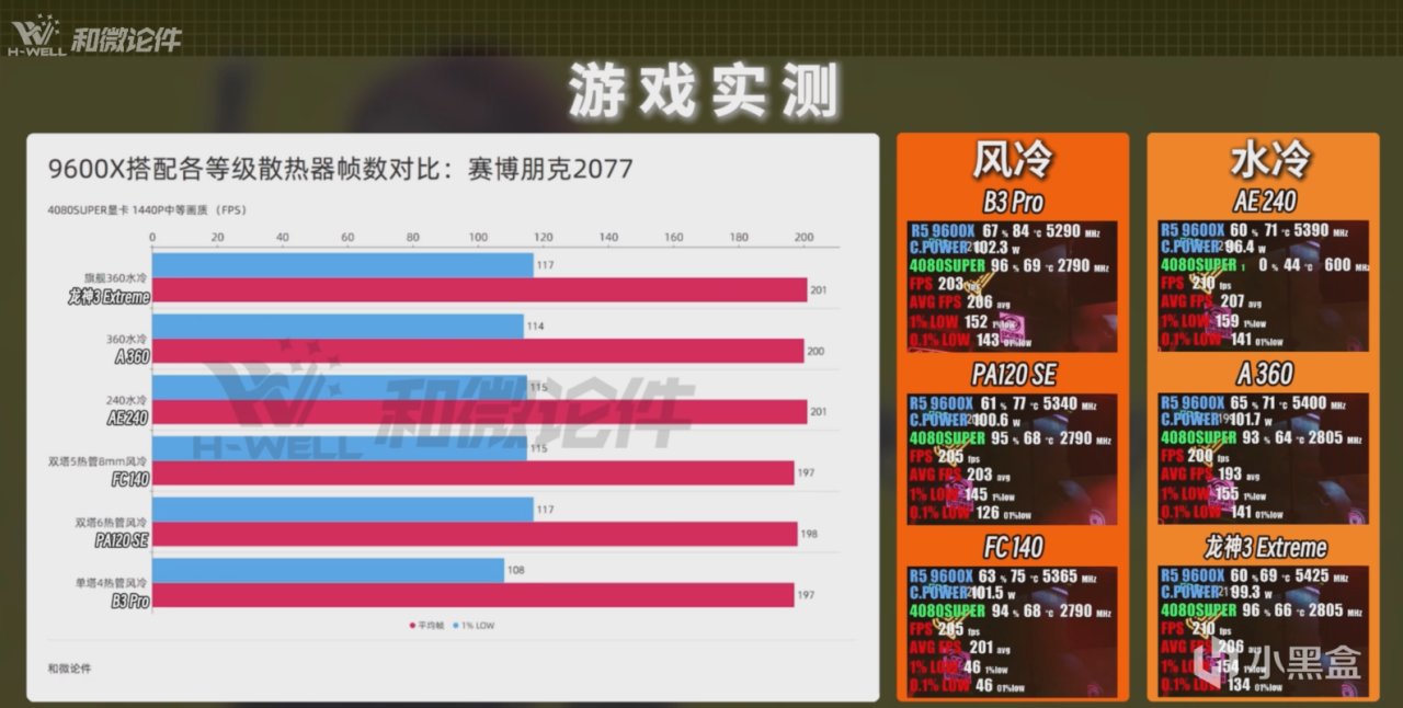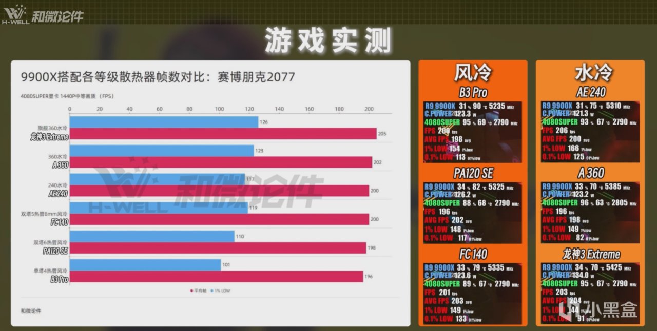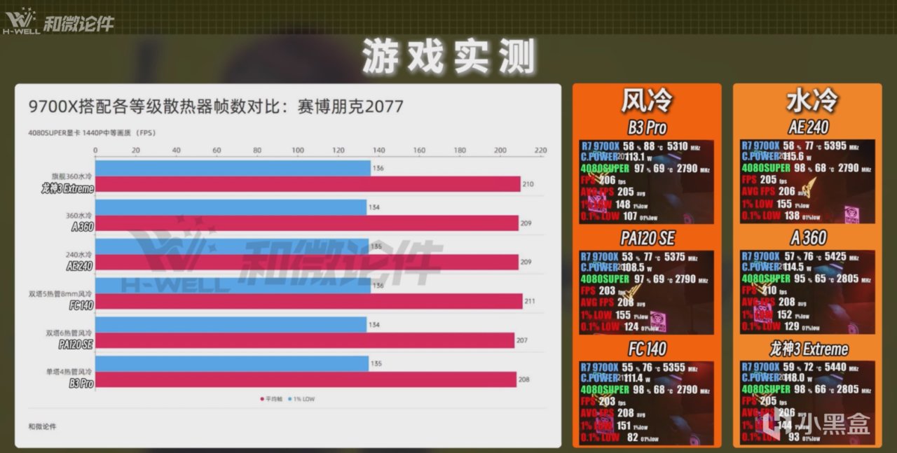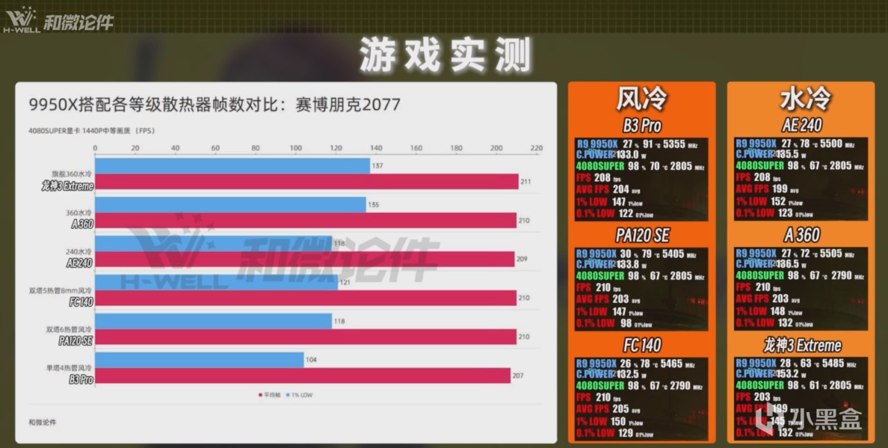 2077測試中,最強的旗艦水冷領先單塔風冷9幀,LOW差距非常大,領先25幀。