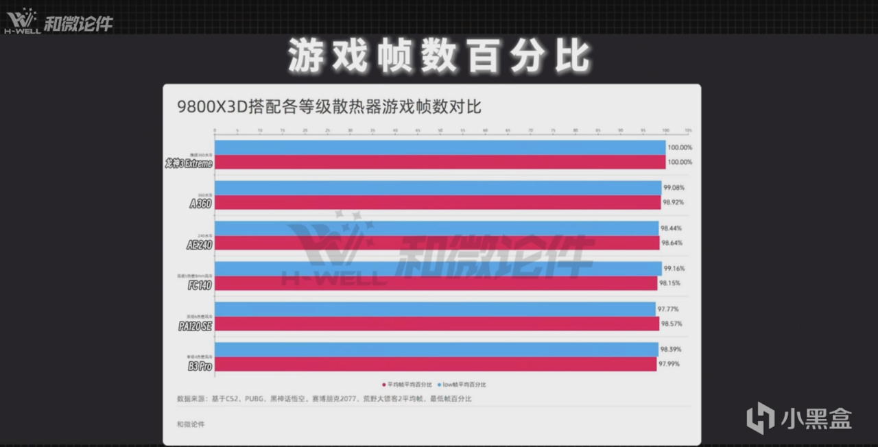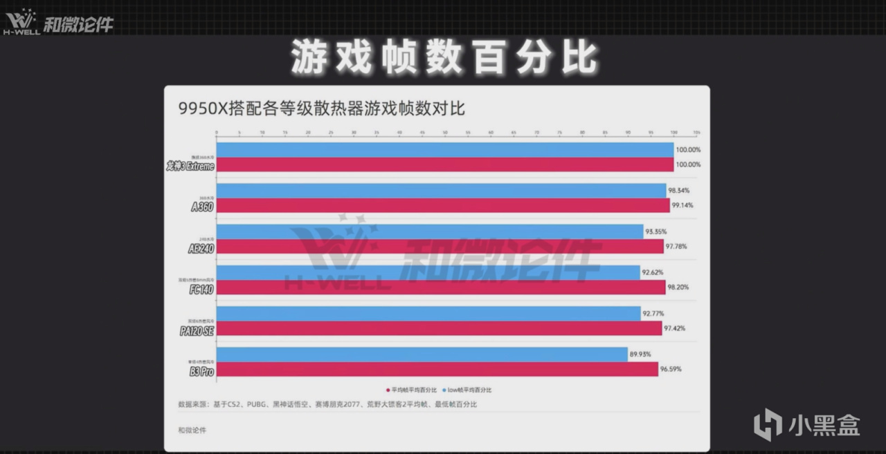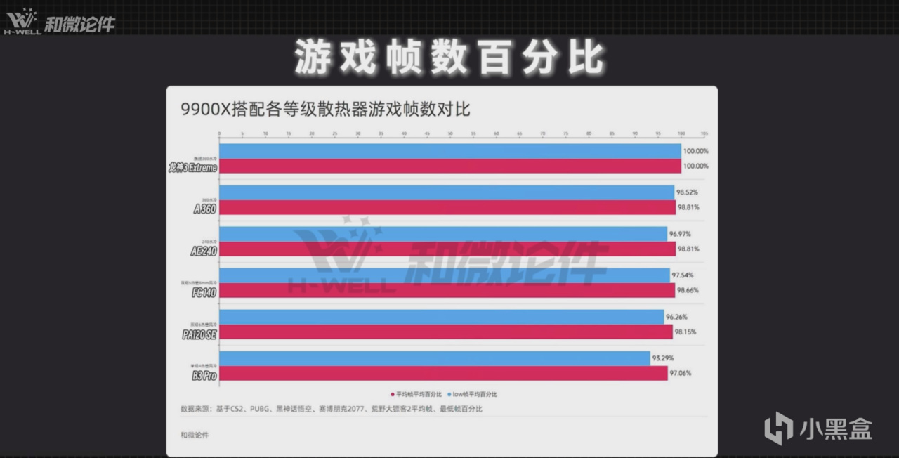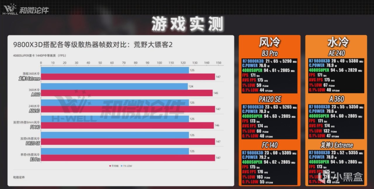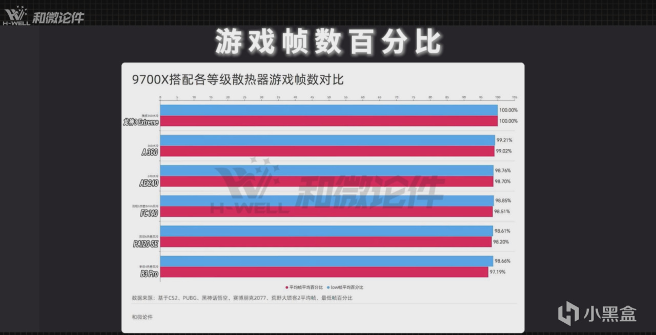 2077測試中,最強的旗艦水冷領先單塔風冷9幀,LOW差距非常大,領先25幀。