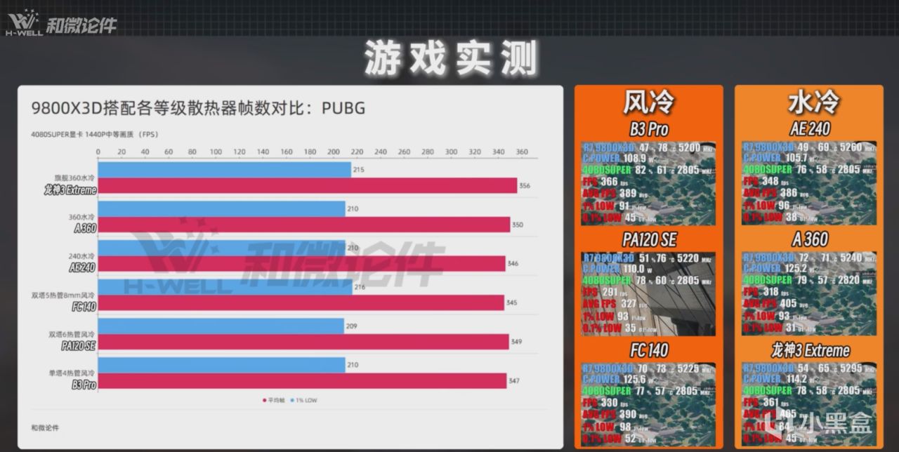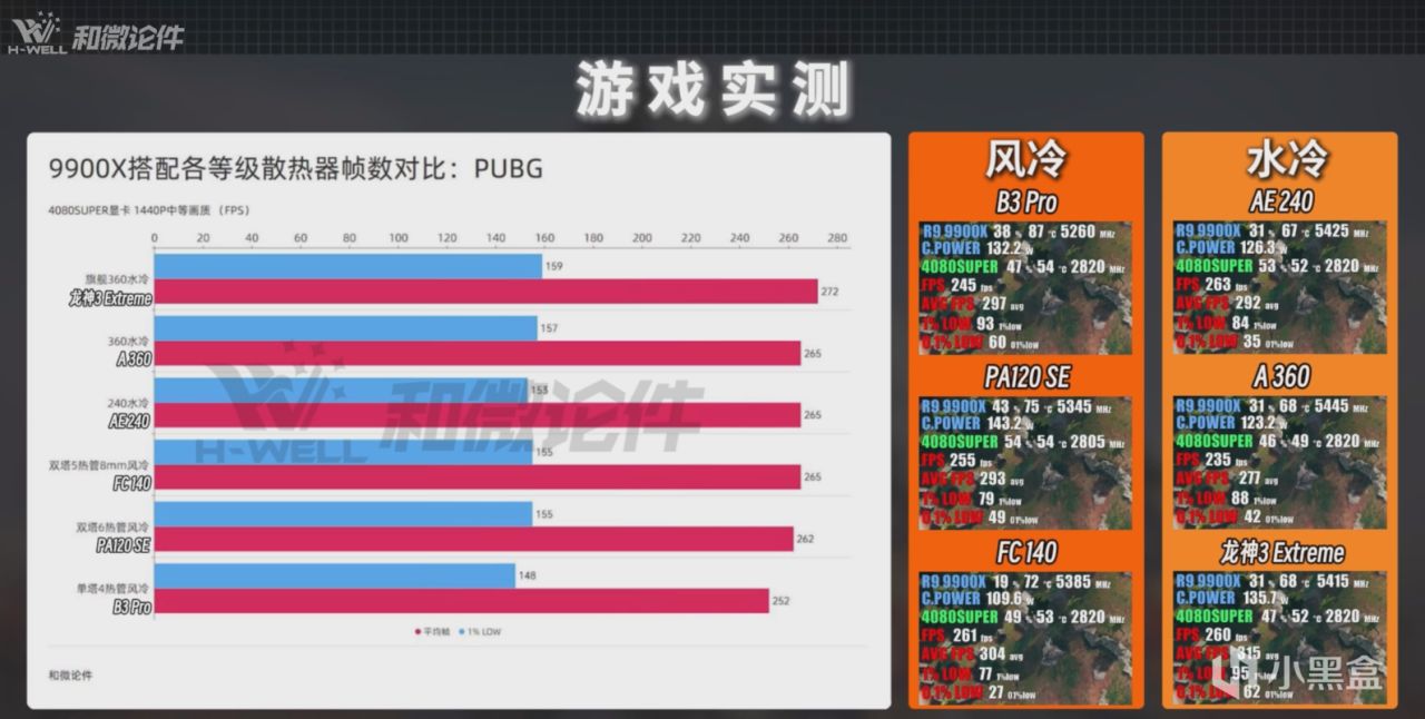 PUBG中,除了單塔風冷之外,其餘幀數都在260幀以上,旗艦水冷突破270幀, 最高與最低的差距爲20幀;LOW幀這次大部隊在155幀左右,單塔風冷低於150幀,旗艦360接近160幀。