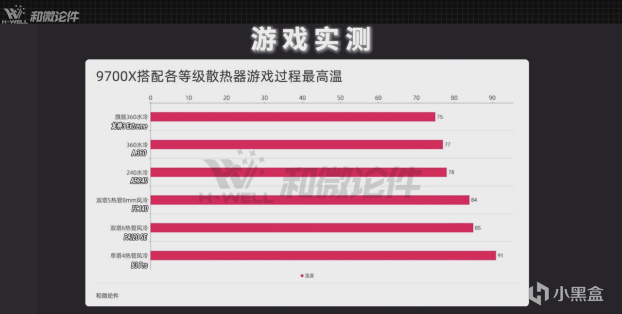 再來看所有遊戲中的最高溫度,單塔風冷麪對9700X玩遊戲的最高溫度在91度,龍神3 EXTREME 則能將最高溫壓制在75度。
