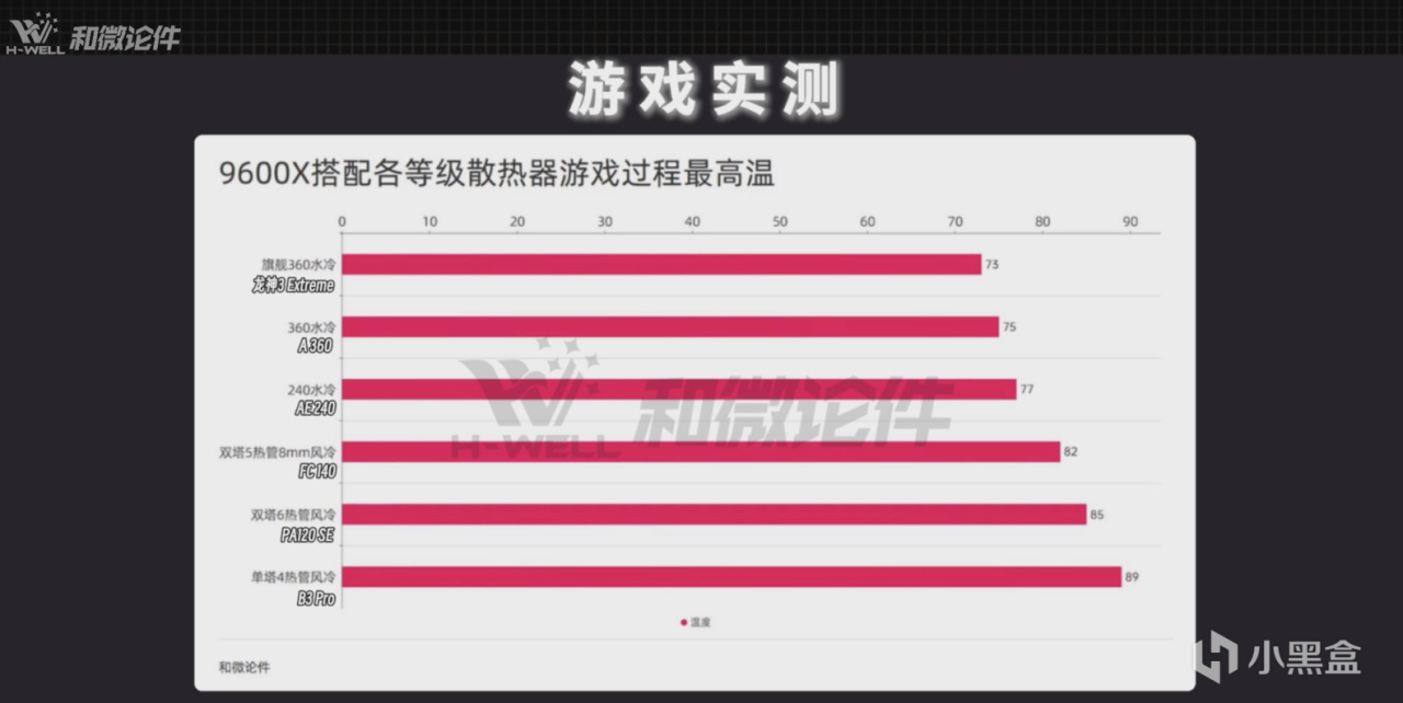 再來看所有遊戲中的最高溫度,也基本都出現在2077的BENCHMARK中,單塔風冷麪對9600X玩遊戲的最高溫度在89度,龍神3 EXTREME 則能將最高溫壓制在73度,