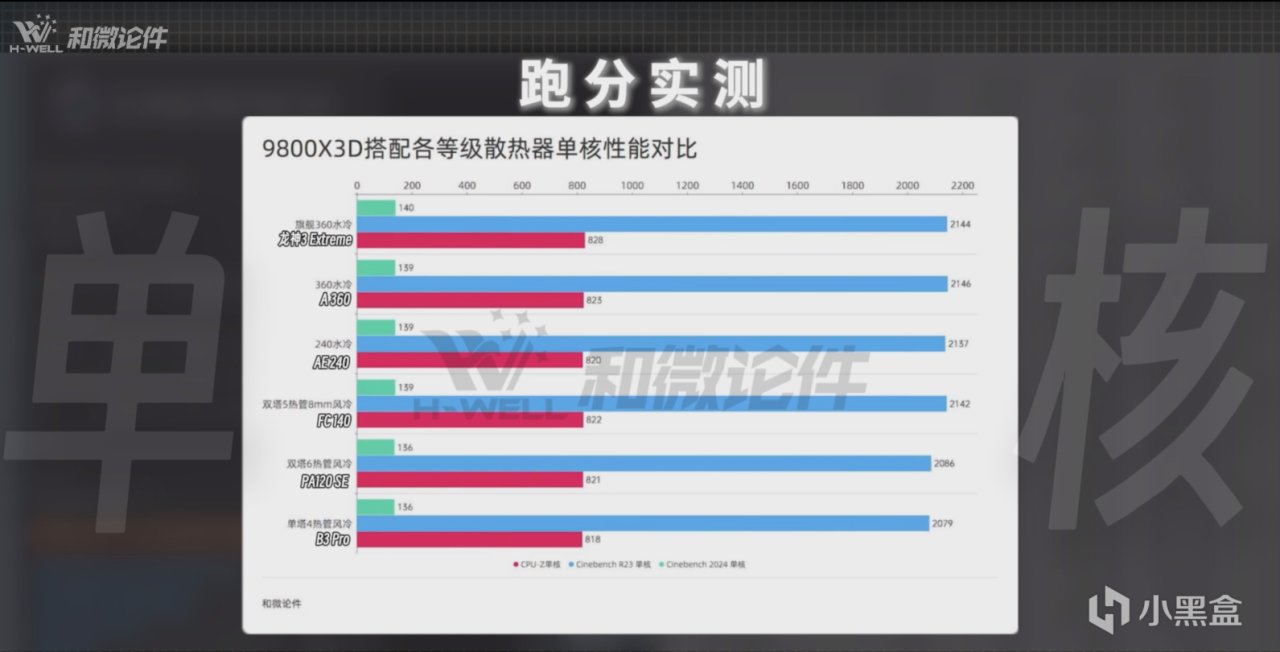 再看跑分測試,單核性能這邊,得益於稍高的頻率,搭配旗艦360水冷的9800X3D在各個測試中總是能夠得到最高的分數,平均領先單塔4熱管的B3 Pro 2.5%左右。