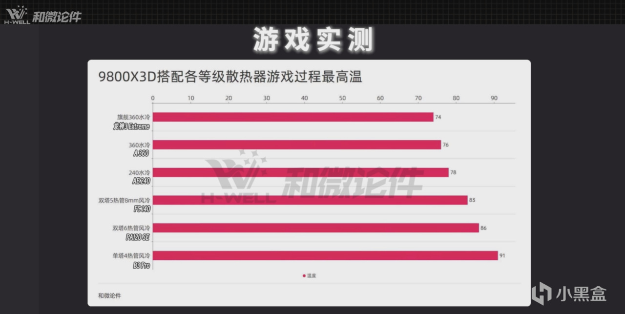 再來看所有遊戲中的最高溫度,基本都出現在2077的BENCHMARK中,單塔風冷麪對9800X3D玩遊戲的最高溫度在91度,龍神3 EXTREME 的最高溫則是74度。