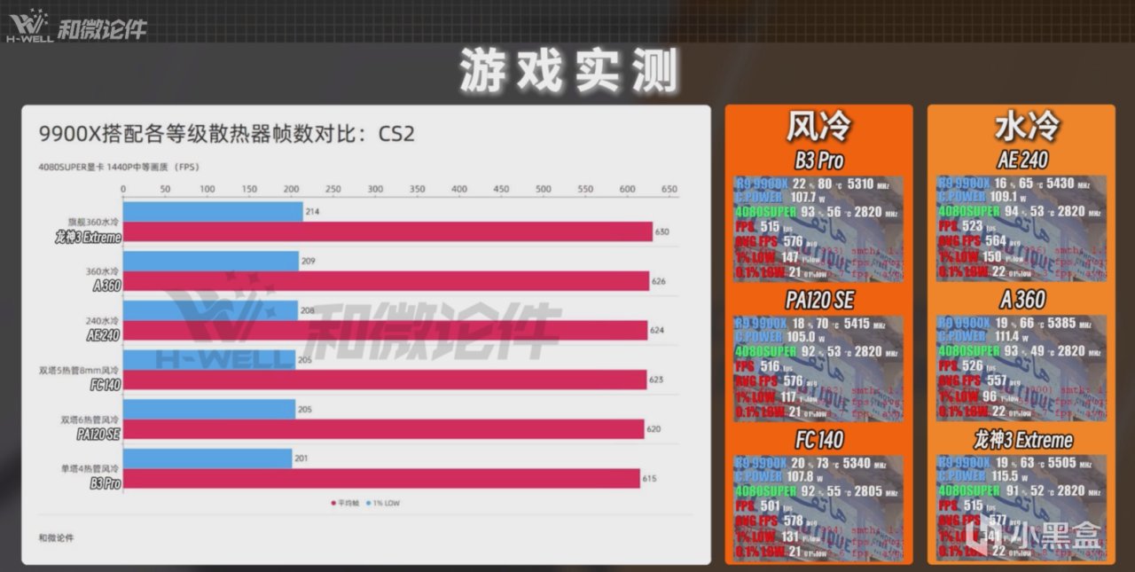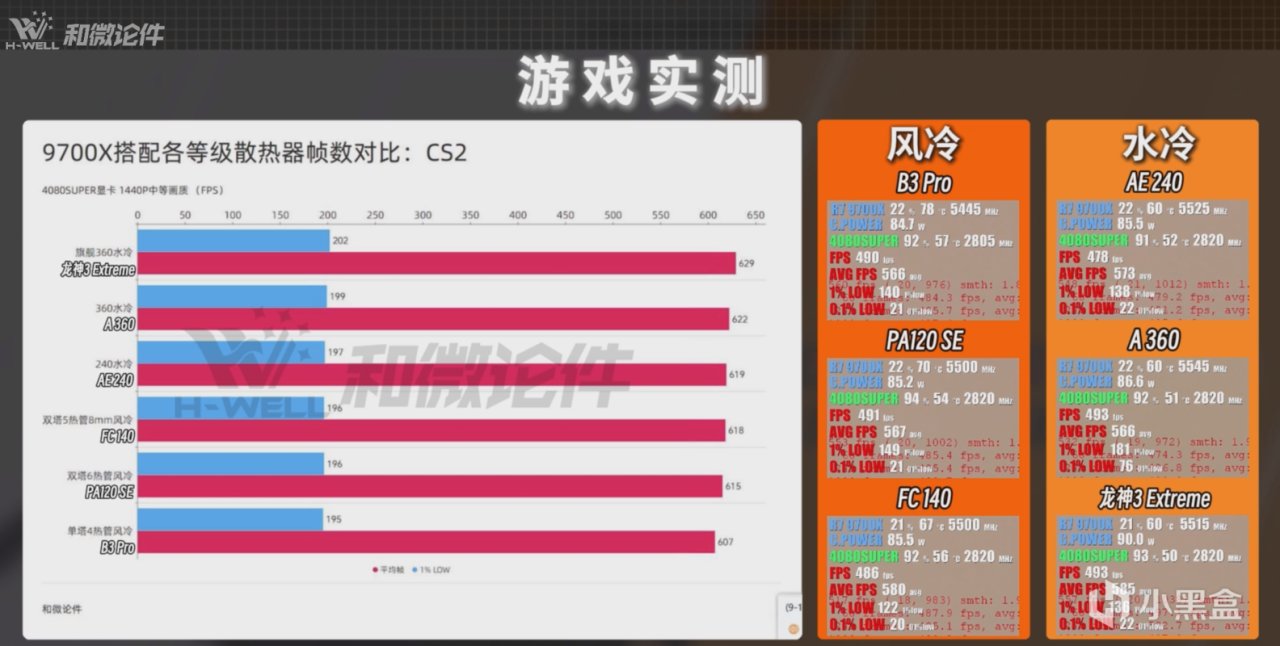 在CS2中,風冷和240水的平均幀都在620幾幀,旗艦360水冷達成630幀,1%LOW幀方面,都有200幀以上,僅有旗艦水冷突破了210幀。