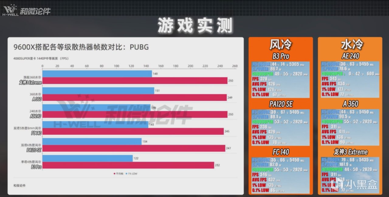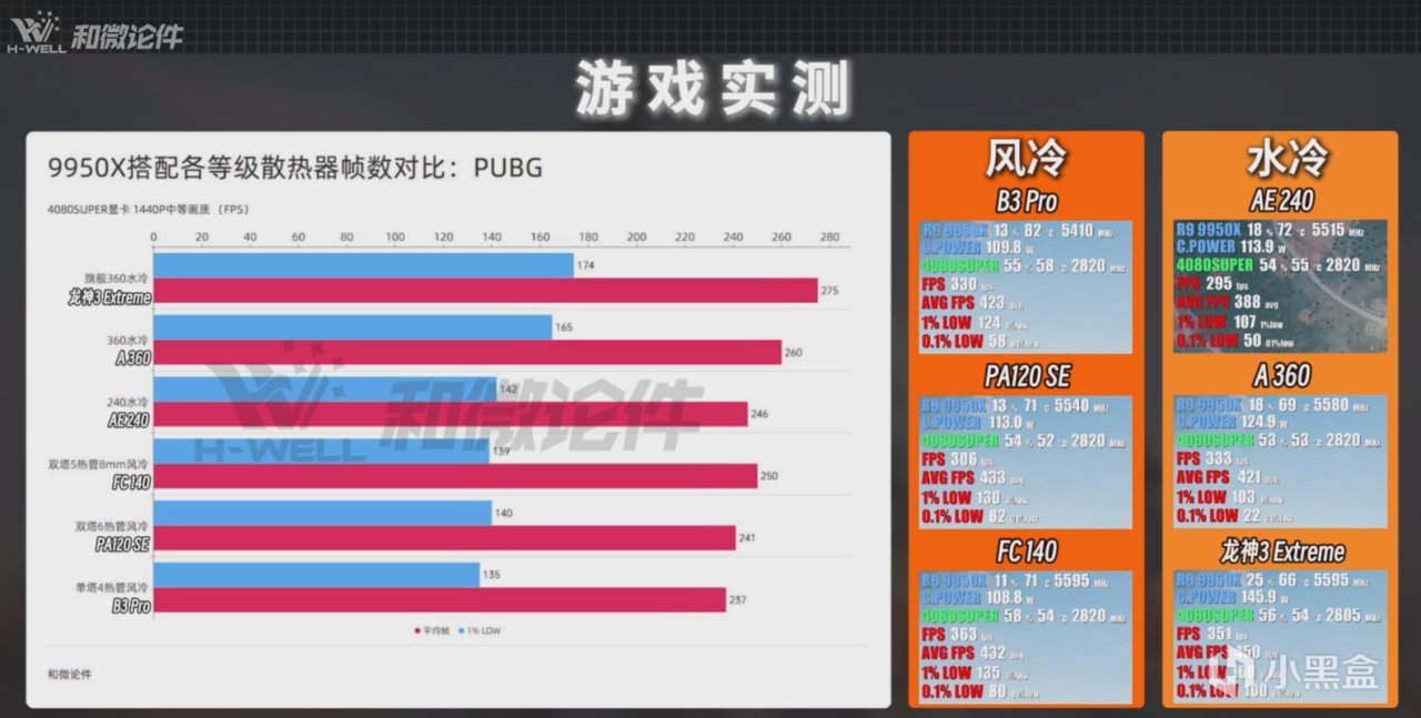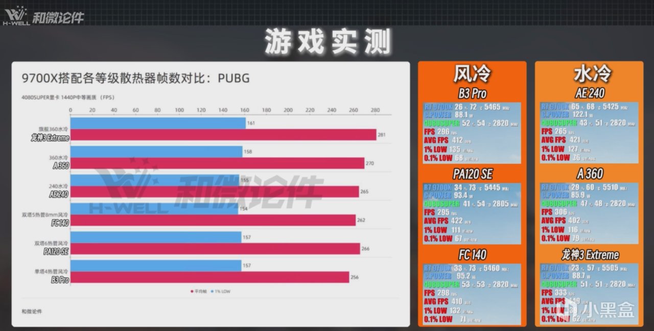PUBG中,除了單塔風冷之外,其餘幀數都在260幀以上,旗艦風冷更是來到了280幀以上,最高與最低的差距爲25幀,有8.9%的幀數差距,LOW幀這次大部隊在155幀左右,龍神3突破160幀。