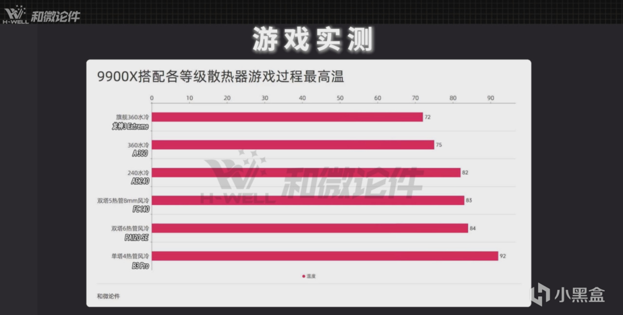 再來看所有遊戲中的最高溫度,單塔風冷麪對9900X玩遊戲的最高溫度在92度,龍神3 EXTREME 則能將最高溫壓制在72度。