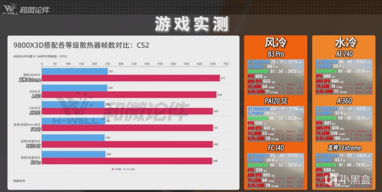 在CS2中,風冷和240水的平均幀都在650幀左右,360水以及旗艦360水冷,幀數有不小的領先幅度,分別爲664和667幀,1%LOW幀方面,風冷和240水都在240幀左右,兩款360水都在250幀左右。