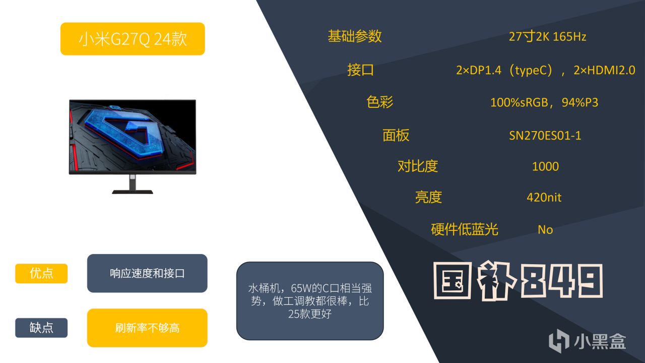而雙十一缺貨的小米G27Q老款現在終於上架啦。這臺機器一直是我千元價位最推薦的機器。雖然只有165Hz刷新率,但是他的調教做的非常到位,色彩表現基本是這個價位除了QD量子點機器外最好的。而小米顯示器的做工一直都非常優秀,並且,他還有一個支持65W充電的C口,對於筆記本外接的小夥伴,我每次第一個想到的就是這臺機器。響應速度和各方面的調教一點也不差。24款的G27Q在我這邊顯然是比25款更好更值得購買的產品。