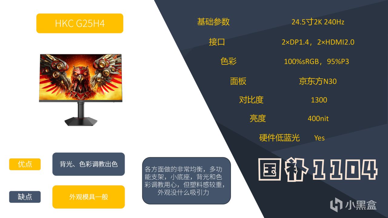 第一臺推薦HKC 的獵鷹G25H4,各項參數基本拉滿,在衆多競品中,對於色彩的調教和背光的運用,這臺機器應該是拔尖的存在,400nit亮度和95%的P3色域,保證了基本的畫面表現,硬件低藍光更是很多靚仔喜歡的點。小底座不佔用桌面空間,OSD各項基本的遊戲支持都有,這臺機器在性能上基本是沒有短板的,最大的缺憾就是這個模具比較掉價