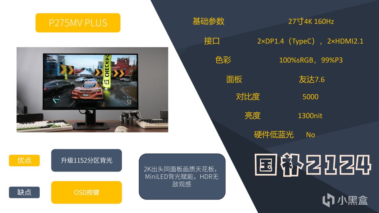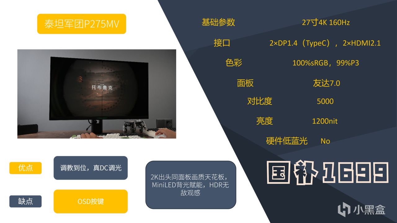 那麼友達7.0面板觀感質變的產品,就是這臺泰坦軍團P275MV了,這也是我認爲的2000出頭最好的4Kminiled顯示器。雖然只有576分區背光,但是整體調教相當到位,色彩調教非常出色,miniled帶來的高對比度和超高亮度,讓傳統IPS顯示器的觀感有了質的提高,而且是DC調光,HDR表現非常出色,是我非常喜歡的一臺機器,但是呢,泰坦軍團做了另一臺顯示器