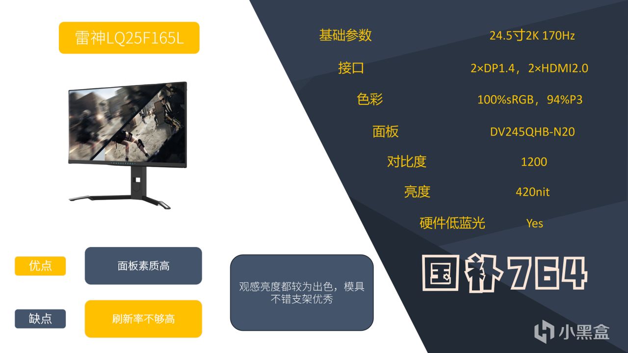要找一臺觀感上更好的機器呢,有。雷神LQ25F165L,採用了京東N20面板。在今年早些時候,這臺機器一直都是1100以上的價格,顯然是用來割韭菜的產品。隨着華星光電面板產品的普及,這臺機器的價格終於雪崩。相對比競品,他顯然有着更好的模具和支架,京東方面板的通透性和高達1300的對比度,顯然讓觀感得到了提升。並且它還支持4K映射 硬件低藍光,899元的價格還是非常具有性價比的,畢竟再不降價就賣不出去了。