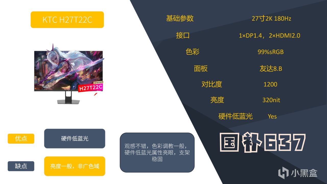 入門2K 180Hz的產品,推薦KTC的H27T22C。首先要知道,700價位的機型不會有特別出色的高參數和高性能。而這臺H27T22C在保證了一定的色彩表現,觀感不錯,OSD功能到位,模具和支架用料不差的情況下,有着出色的硬件低藍光屬性,整體沒有大的缺陷。非常值得入門選擇。並且這個價位也是入門辦公機的領域,但是任何一臺辦公顯示器都達不到H27T22C的色彩,高響應速度以及硬件低藍光。強烈辦公兼職