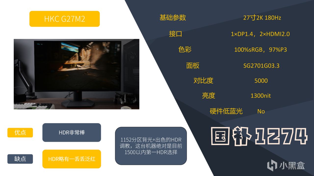 這臺HKC G27M2的出現,代表2K用戶終於等來了HDR顯示器。第一眼就是視覺上的升級,全新的模具相較老獵鷹形成了碾壓,視覺及觸感有了明顯的高級感,金屬支架順滑調節,1152分區背光高達1300nit亮度,帶來非常棒的HDR畫面表現,無論是色彩表現還是背光調校,這臺機器的成熟度非常高,在這個價位應該是沒有任何一臺機器的HDR表現超過它了。唯一的缺陷就是觀感有一丟丟的泛紅,不影響使用。至於miniled的光暈,這不是它的問題。
