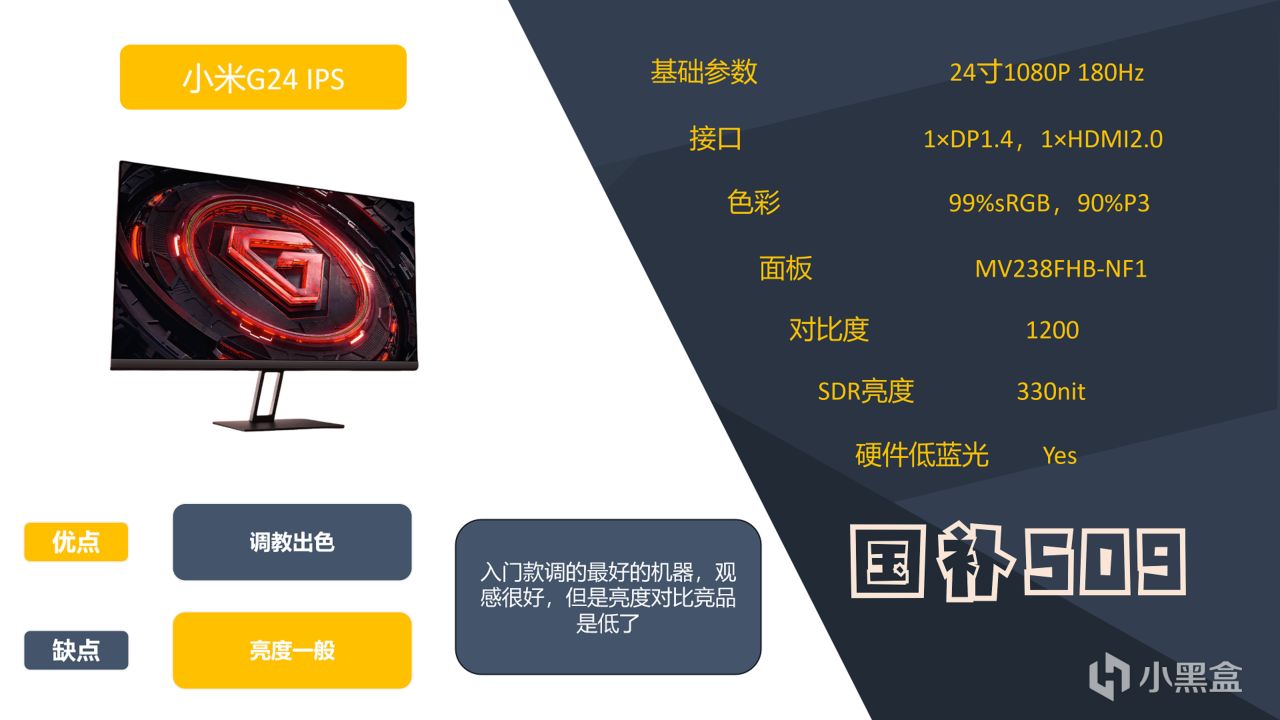 首先是24寸1080P顯示器的入門款。首推紅米這臺G24 IPS版本,老闆的小米G24是VA面板,強烈不推薦購買,這臺G24的色彩表現非常出色,對比度高達1300:1,同時有着優秀的響應速度,競品中很難找到一臺在調教上超越他的機器,而且硬件低藍光是它並沒有宣傳的,作爲入門產品是靚仔們優先選擇對象。