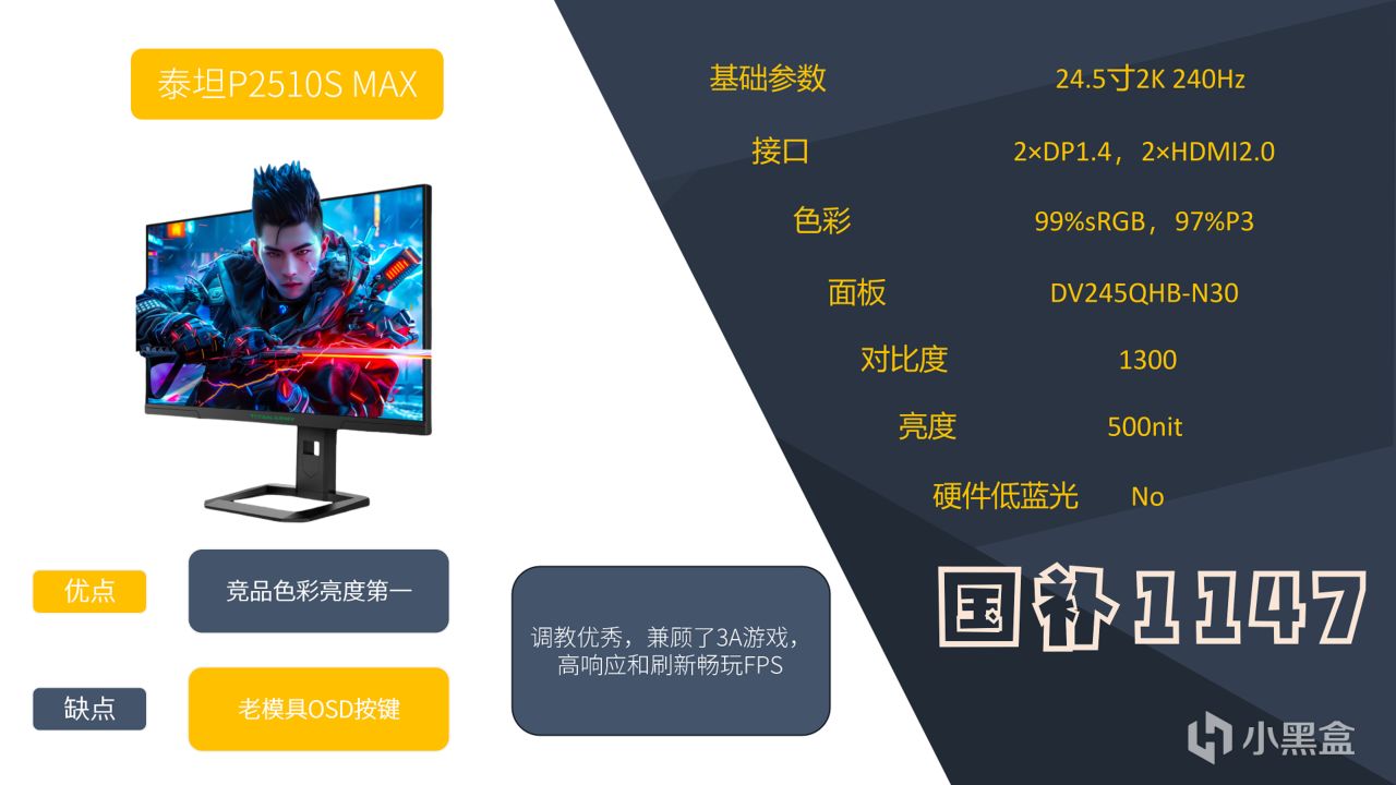 另一臺推薦泰坦軍團的P2510S MAX,面板規格同樣是京東方的N30,但是他的色彩應該是競品中第一的存在。採用QD量子點+特調的高亮度背光,讓他的色彩達到99%的P3色域覆蓋以及HDR500的最佳畫面表現。這臺機器的支架也顯然好過G25H4,塑包鐵的設計在操控和穩定表現上顯然更好。並且OSD功能更豐富。