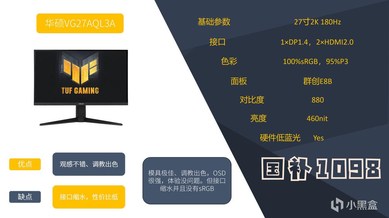 如果你考慮大牌,這臺華碩VG27AQL3A就很適合,華碩的模具、做工和OSD都絕對是這個價位首屈一指的,在性能上色彩調教出色,亮度優秀,響應速度不錯,羣創的面板通透性很棒,僅對比度是劣勢。不過這臺機器最大的遺憾,還是DP1.2接口,只能開啓2K 180Hz 8bit,所以這臺機器綜合來看,是非常適合競技遊戲使用的,對於視頻和3A用戶來說,考慮華碩其他型號吧