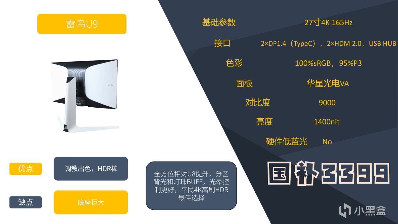 那麼電競顯示器下,目前接觸到的miniled天花板,就是這臺雷鳥U9了,雷鳥U8已經是很棒的產品,但是雷鳥U9在此之上進行了全方位的升級改進。HVA面板天然的對比度優勢,控光分區更是升級了1倍達到2304分區,帶來更好的光暈控制,刷新率升級到165Hz,最爲黑子吐槽的PWM調光也更升級到了DC調光,可以說這臺機器除了巨大的底座,和VA面板天生的可視角度外,在HDR內容上毫無短板。