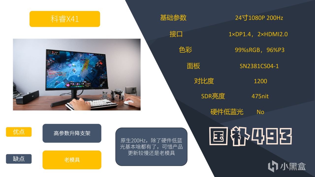 性能上沒有更好的,性價比上找一臺還是沒問題的。科睿X41,面板是惠科自家的CS04-1,從180Hz升級到了200Hz的原生刷新率,而且500出頭的價格標配了多功能支架這是非常不容易的。雖然這個底座很大。在亮度表現上,SDR模式380nit,HDR模式更是達到470nit,表現要強於同規格產品。總而言之在500價位上,這臺機器的性價比真的非常非常突出了。作爲小夥伴的入門機器是值得選擇的。