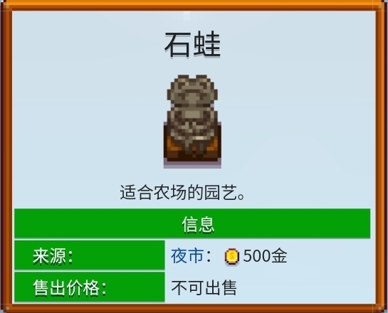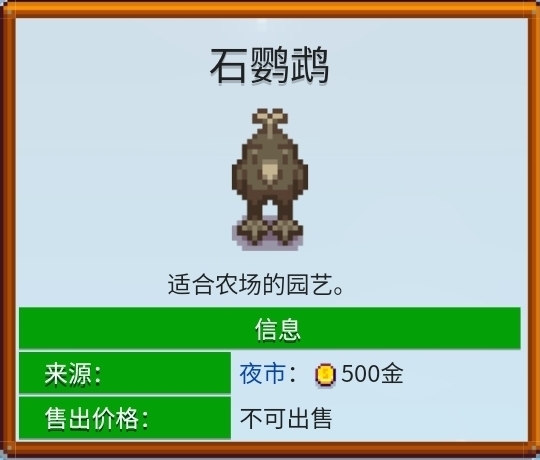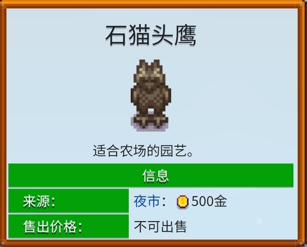 獲取方式:夜晚隨機事件,觸發該事件時,會先播放一段貓頭鷹的叫聲,隨後系統選擇的地塊上便會出現一個石貓頭鷹。