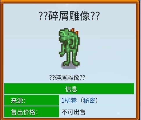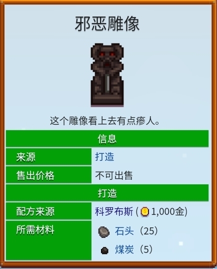 用途:把邪惡雕像放置在史萊姆屋可以防止女巫拜訪此地的時候,導致所有的史萊姆變成黑色。