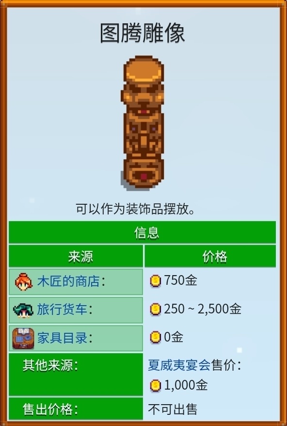 - 夏威夷宴會期間,皮埃爾也會在他的貨攤上出售圖騰雕像,售價是1000金