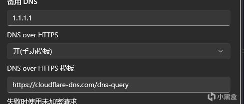 • 在“備用 DNS”字段中,輸入備用的 DoH 服務器地址,例如 1.1.1.1(Cloudflare DNS)。