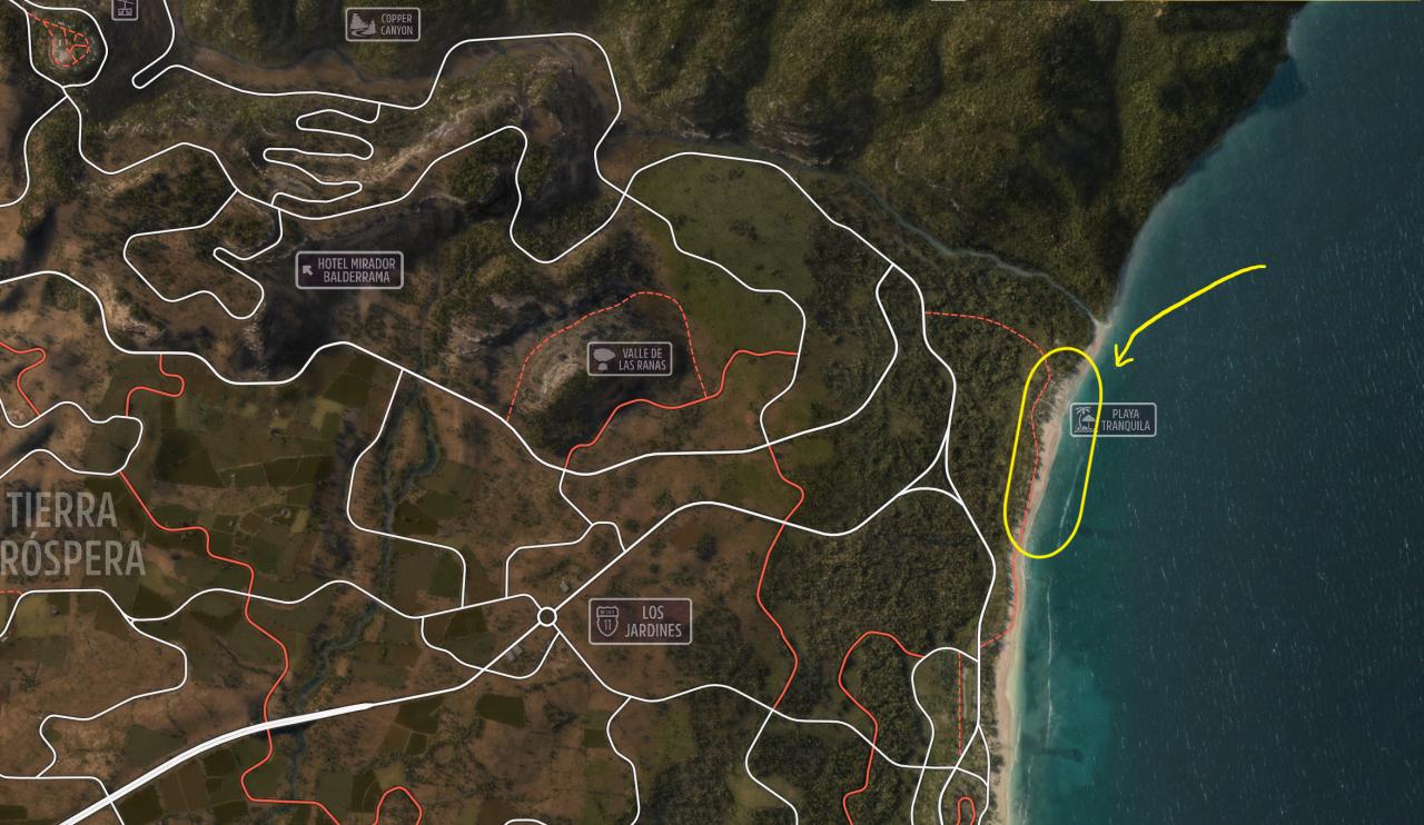 靜謐海灘的位置如圖所示,位於地圖右上角的海岸線邊上,藍色海灘的正上方。