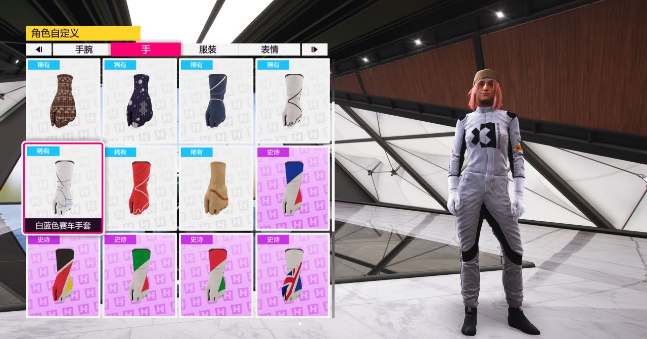 打開角色自定義,爲角色更換任意帶有“賽車手套”後綴的手套即可。