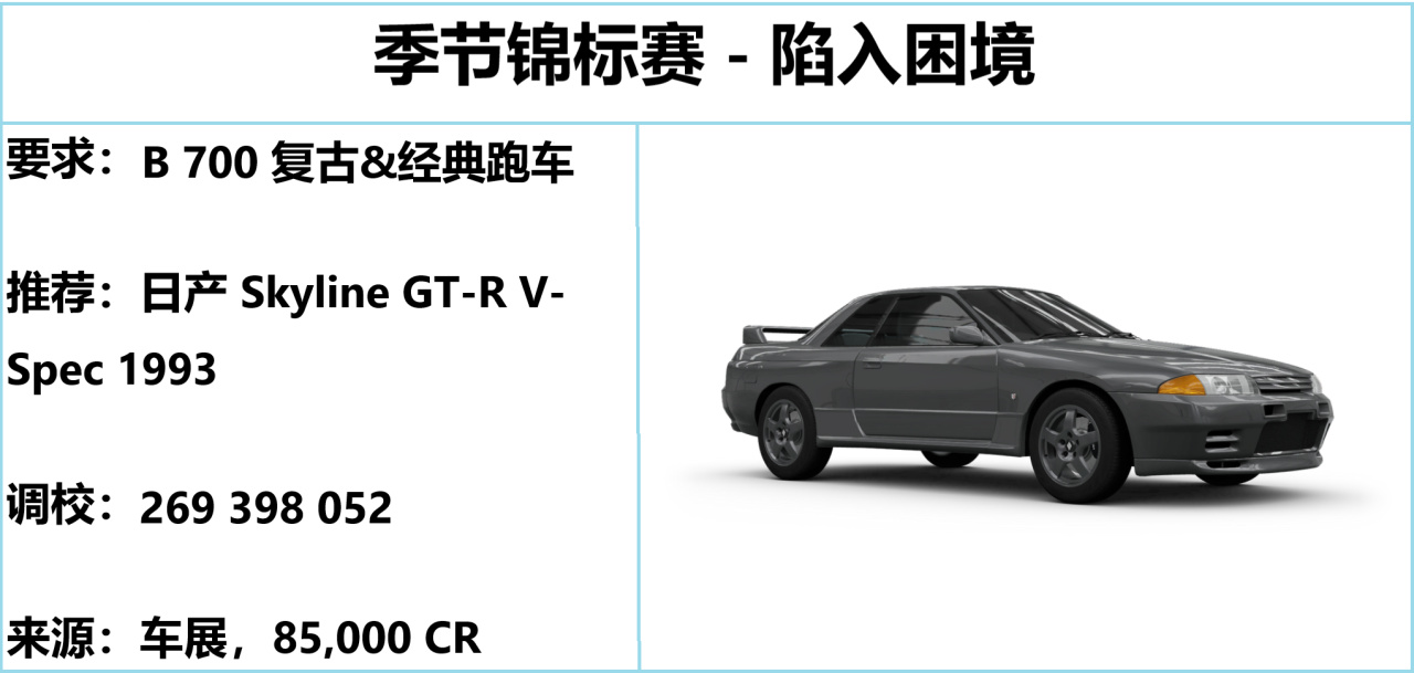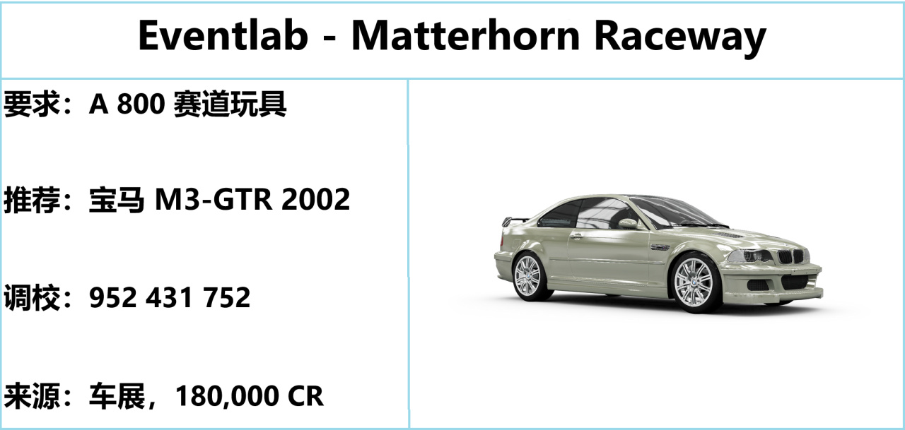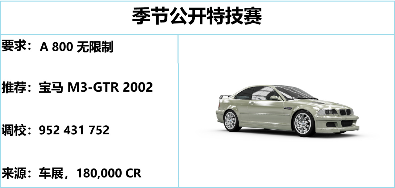 寶馬 GTR 限時返場,動力合適且操控合格,就是爆發力不夠,跑完藍圖還能跑特技賽。